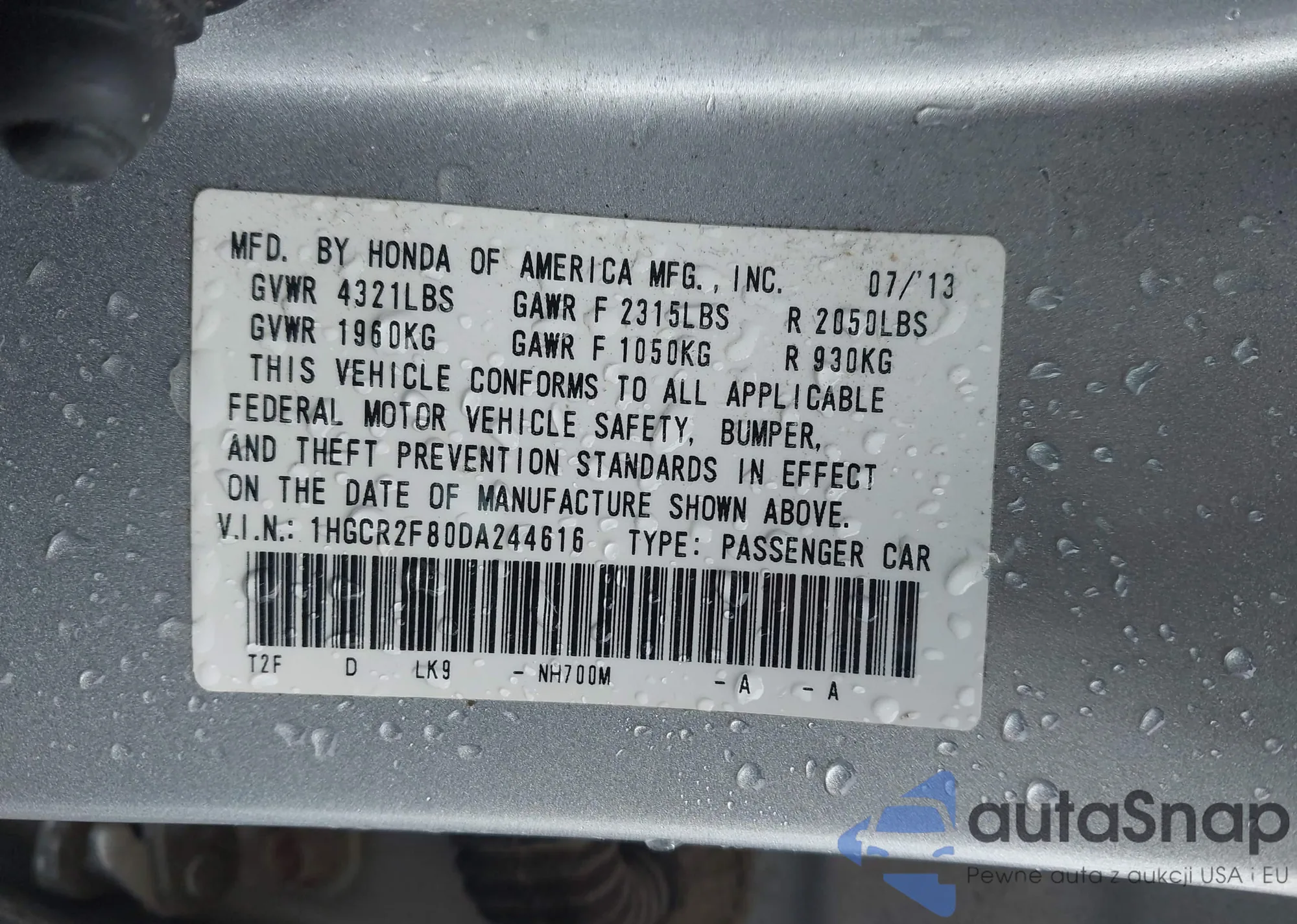 LOT: 43834640 VIN: 1HGCR2F80DA244616