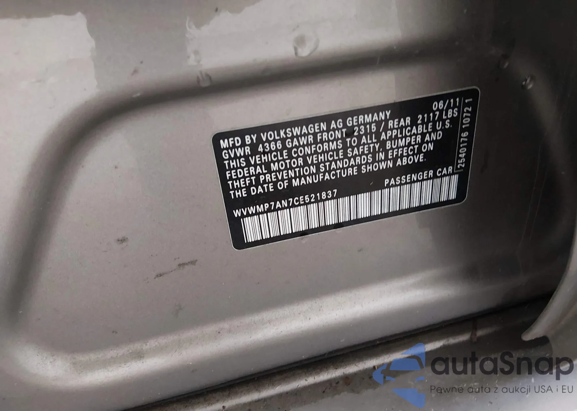 • VIN WVWMP7AN7CE521837
