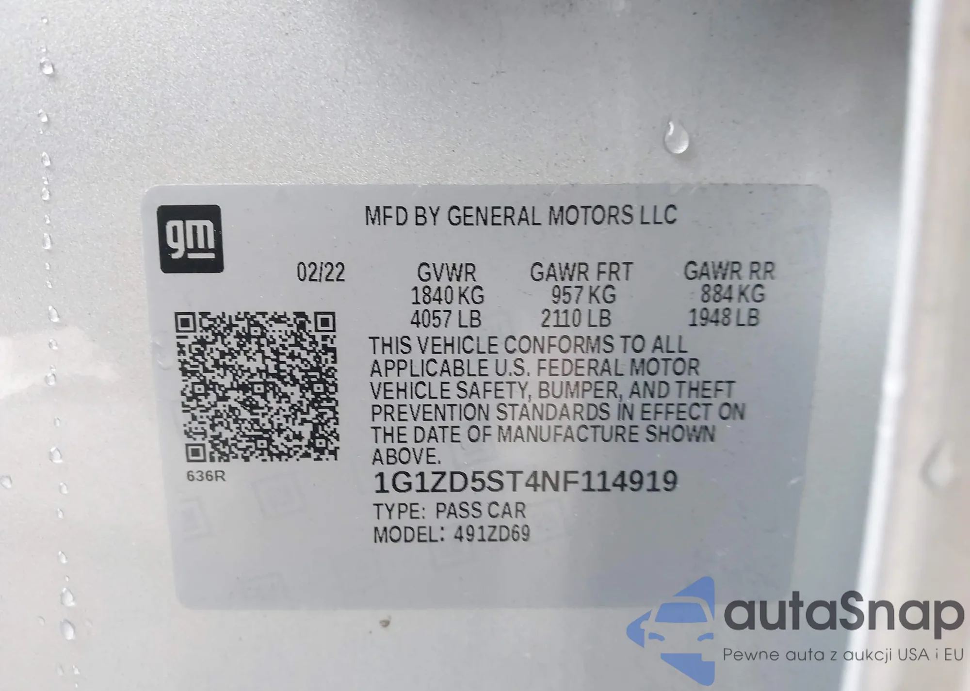 • VIN 1G1ZD5ST4NF114919
