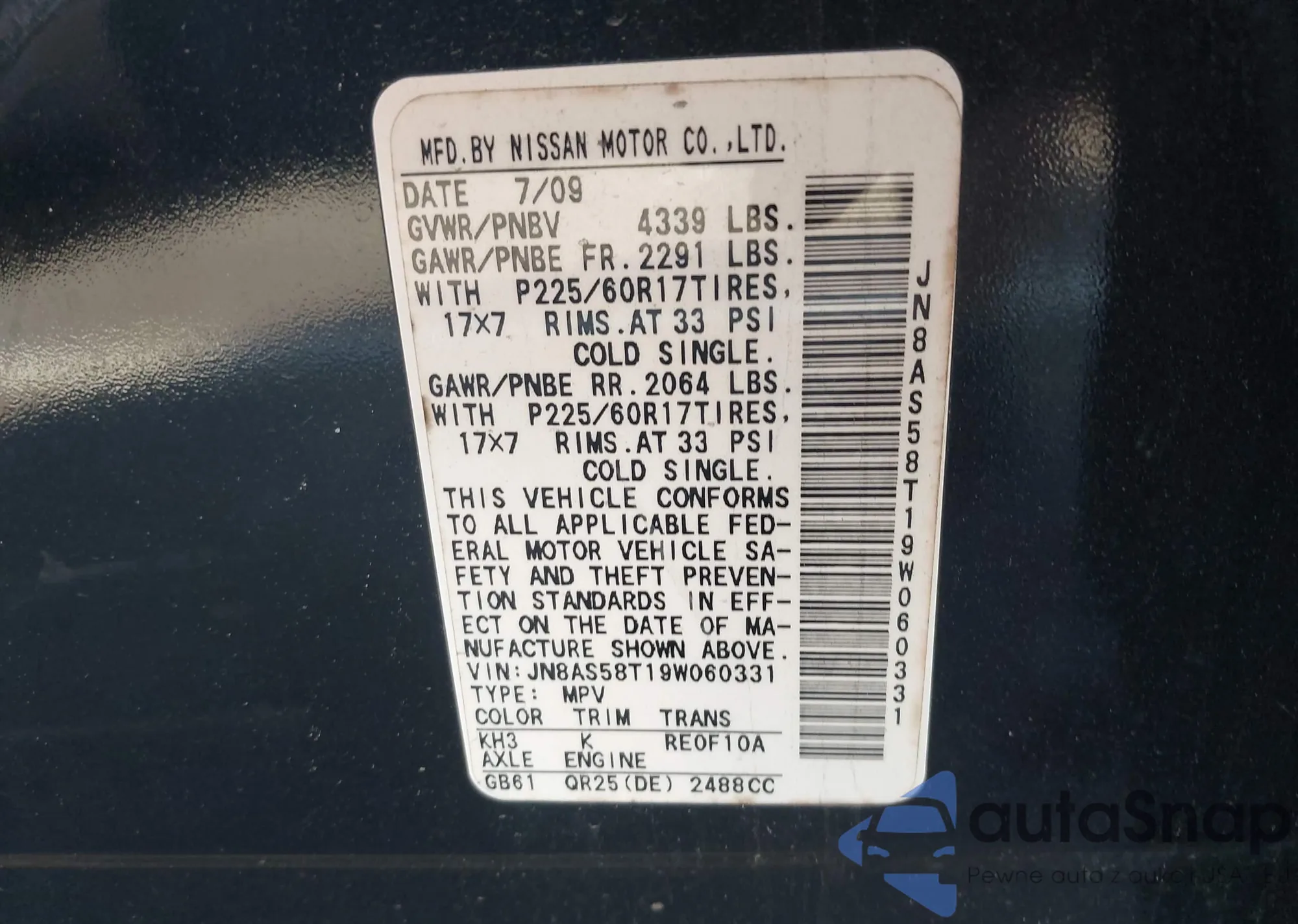 LOT: 43996232 VIN: JN8AS58T19W060331