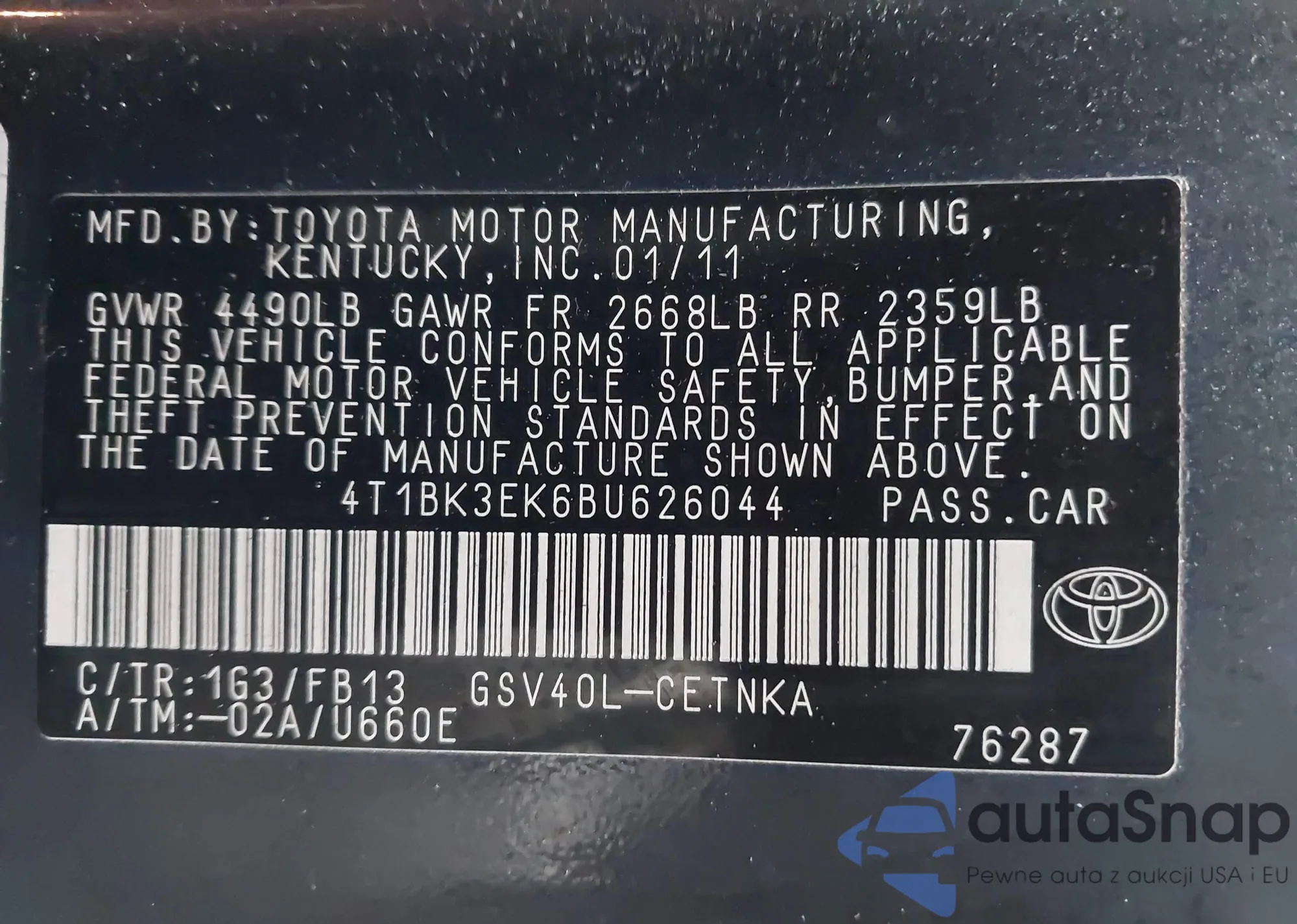 • VIN 4T1BK3EK6BU626044