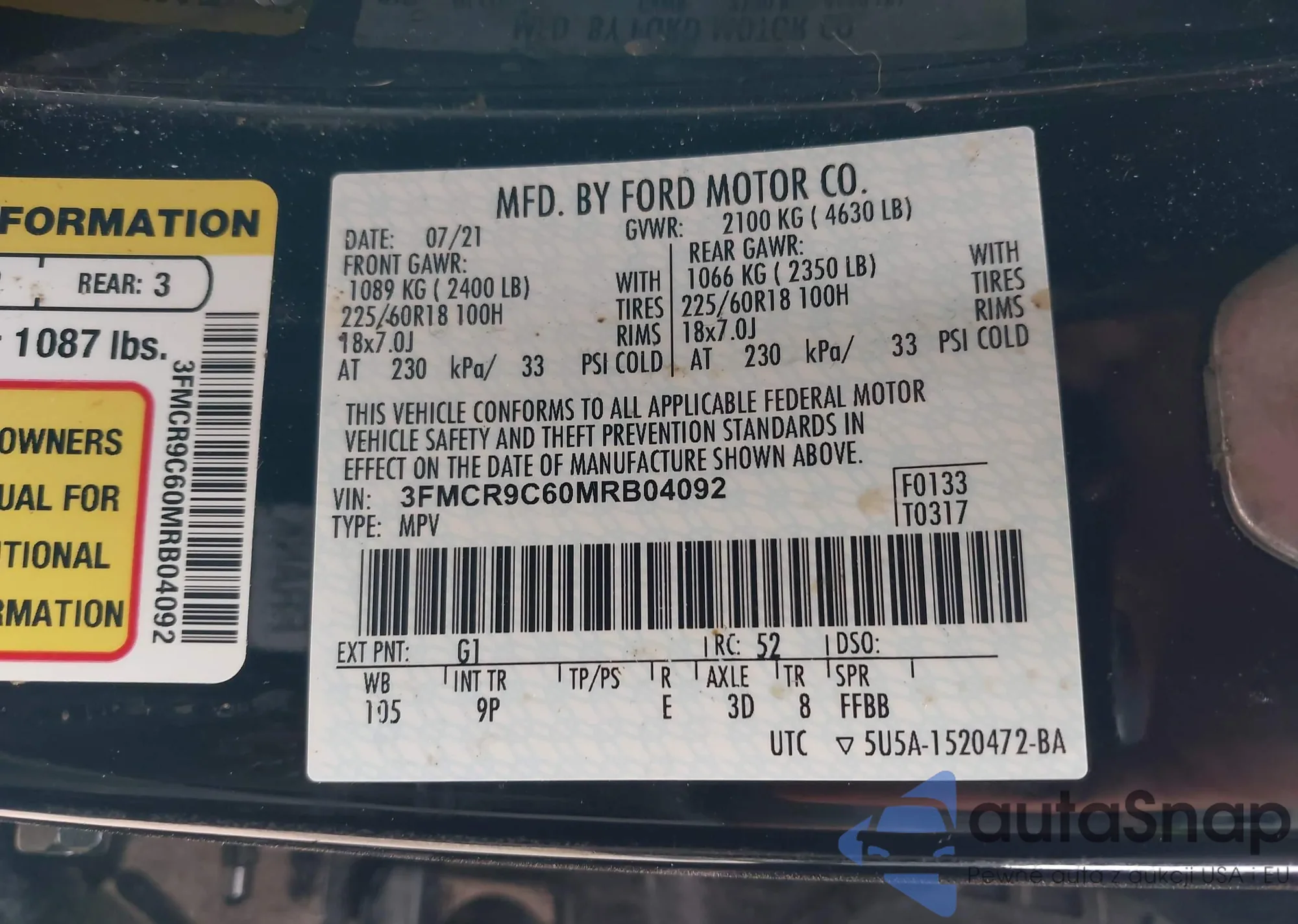 LOT: 43728475 VIN: 3FMCR9C60MRB04092