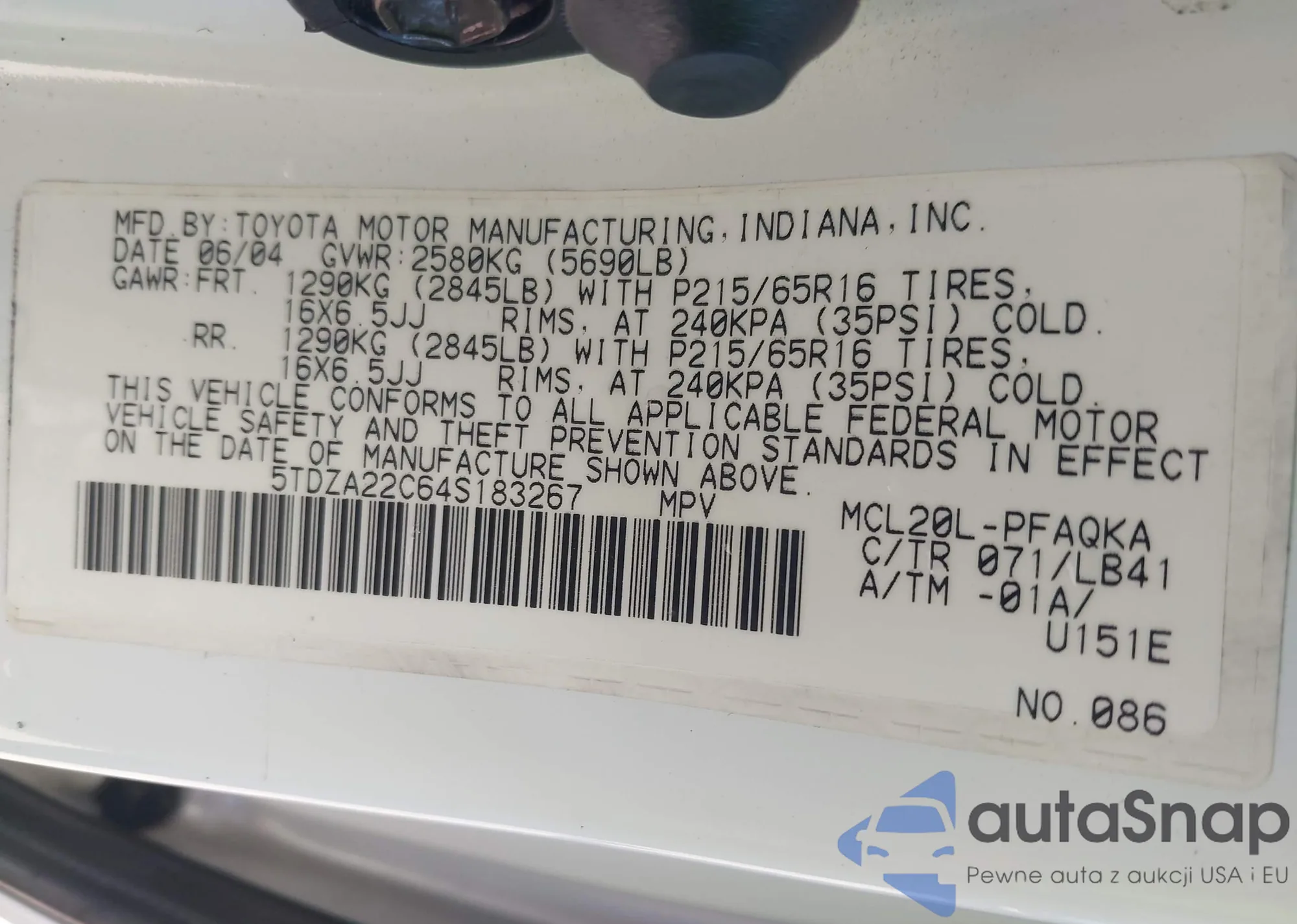 LOT: 43736320 VIN: 5TDZA22C64S183267