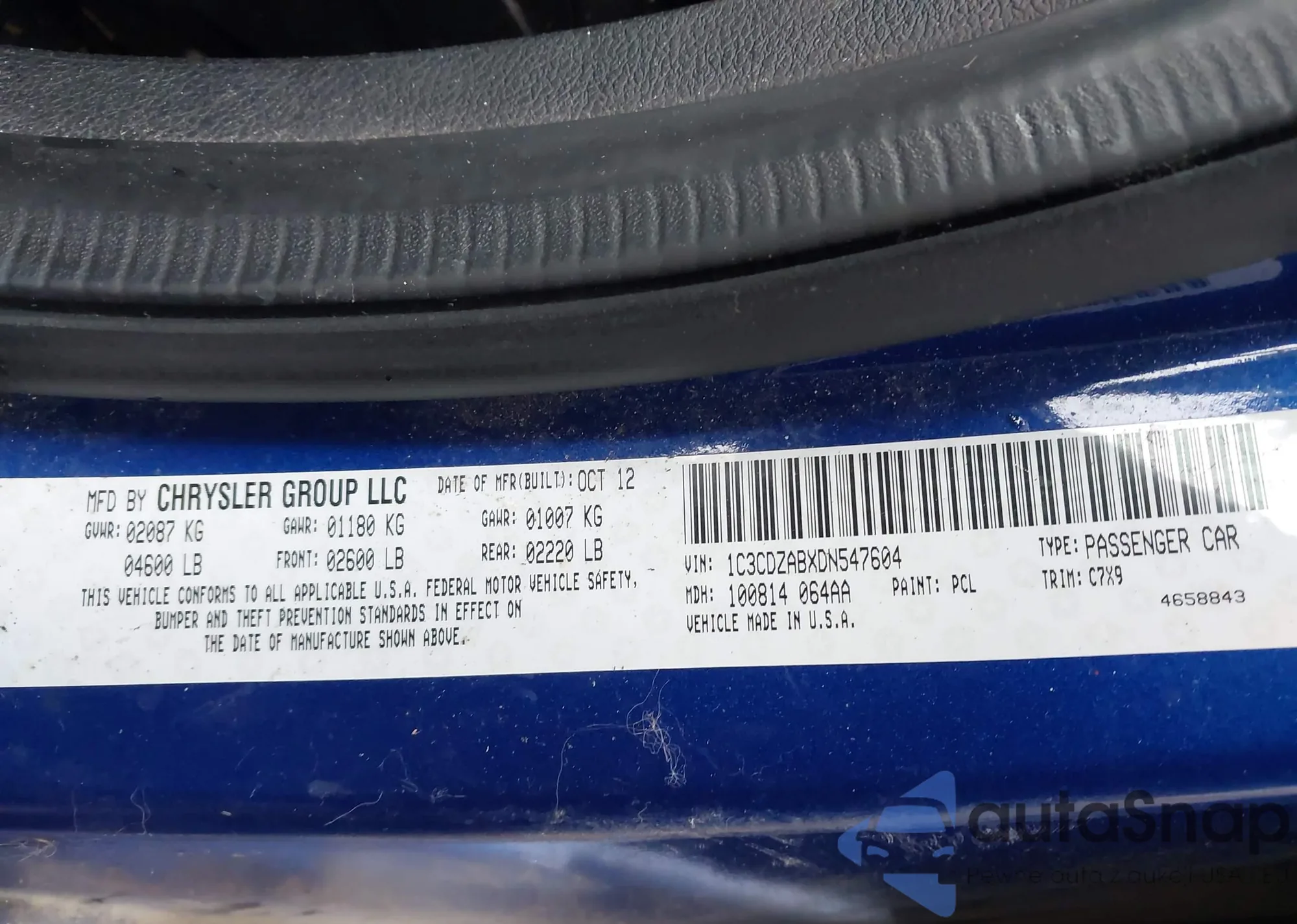 LOT: 43877141 VIN: 1C3CDZABXDN547604