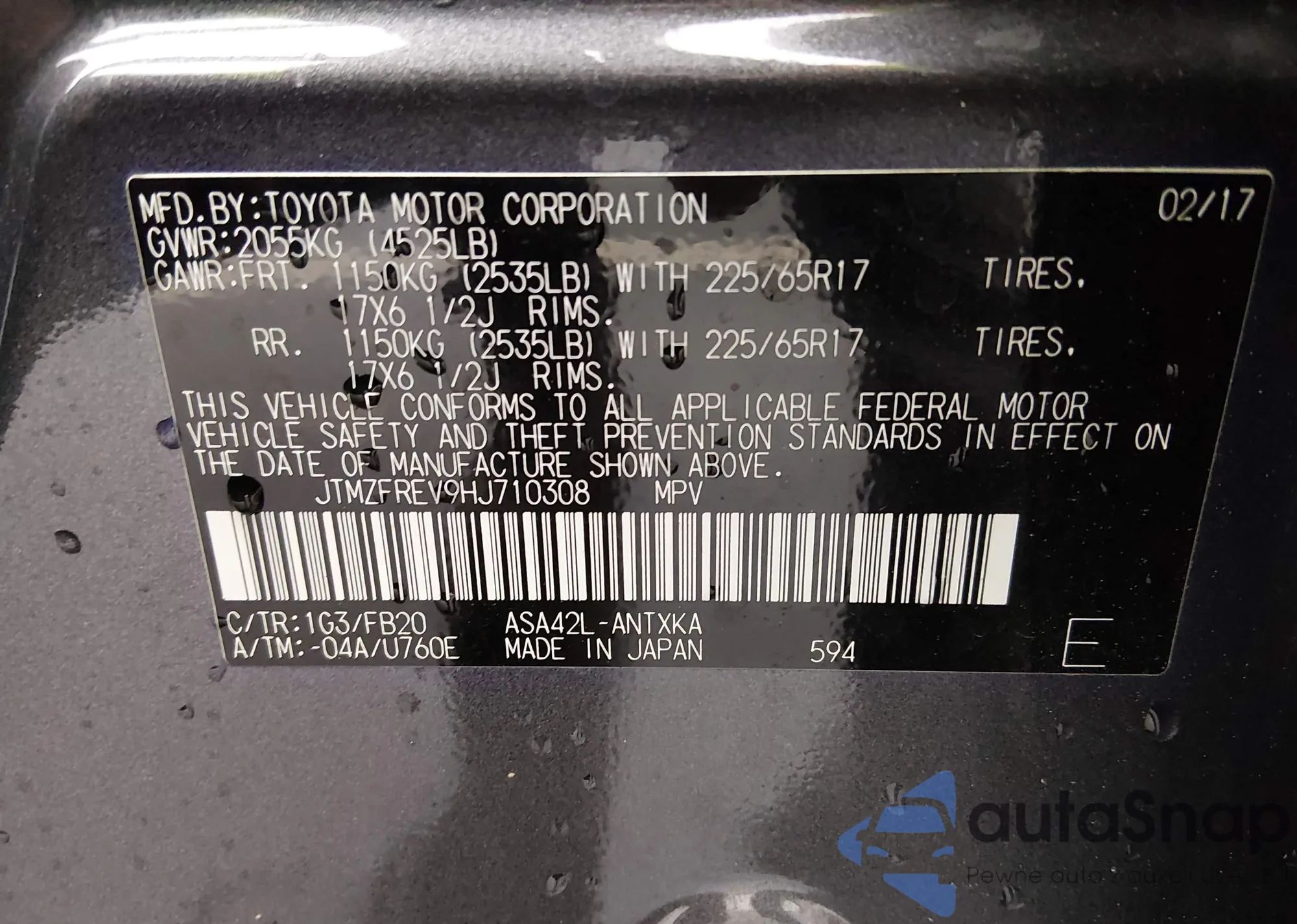 LOT: 43877507 VIN: JTMZFREV9HJ710308