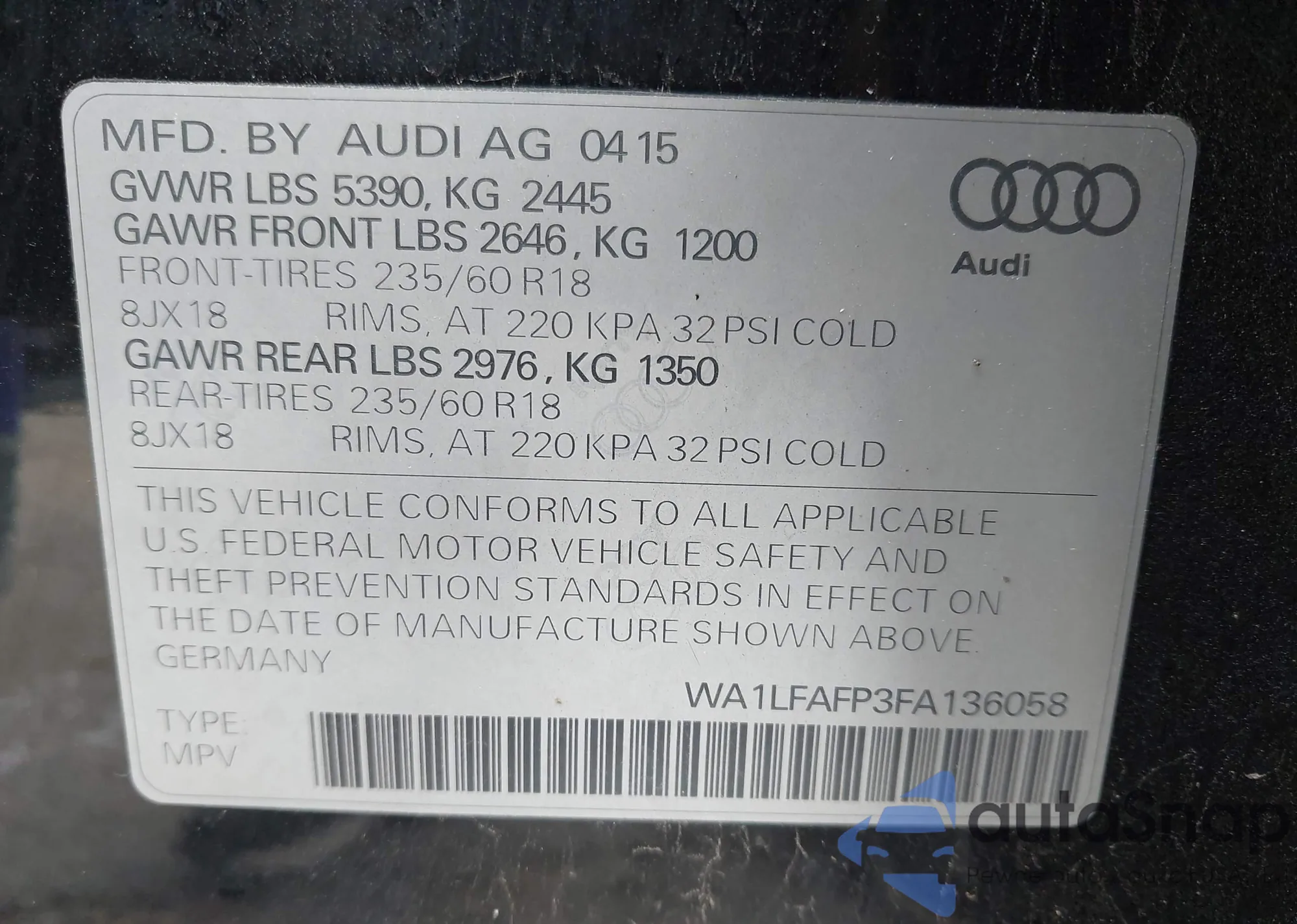 LOT: 43788436 VIN: WA1LFAFP3FA136058