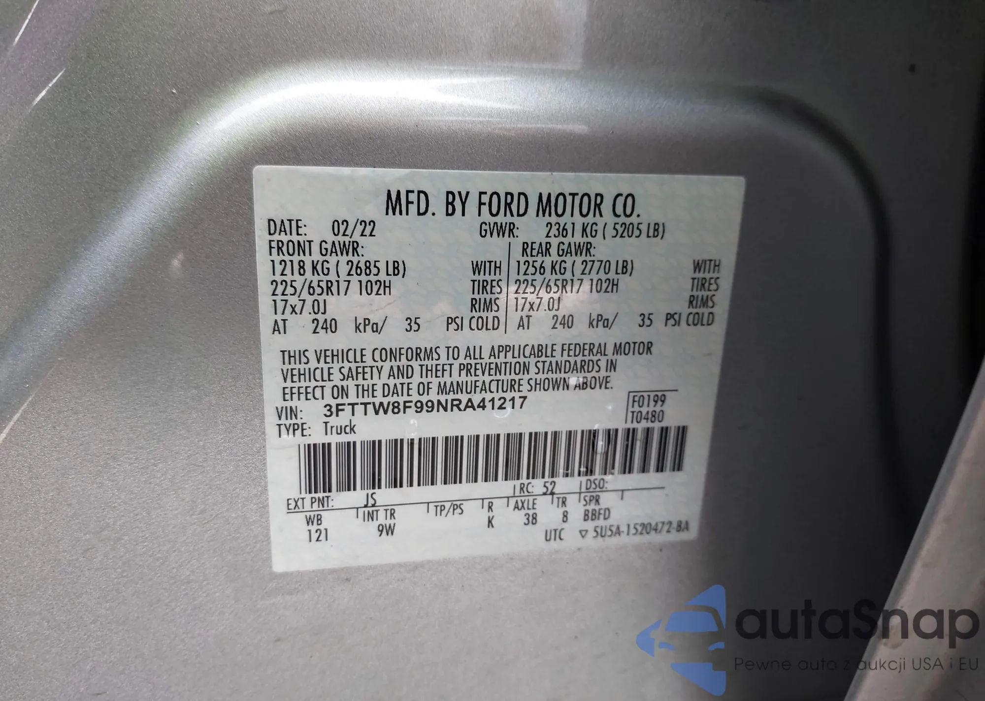 LOT: 43770424 VIN: 3FTTW8F99NRA41217