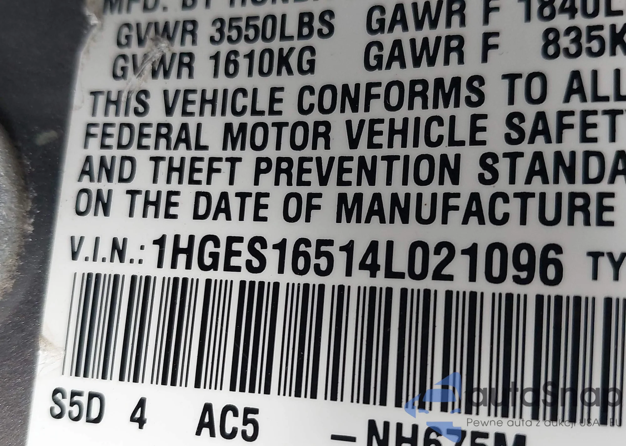 LOT: 43948265 VIN: 1HGES16514L021096