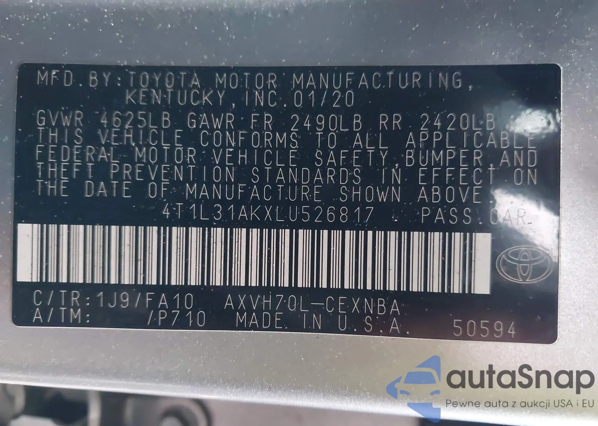 • VIN 4T1L31AKXLU526817
