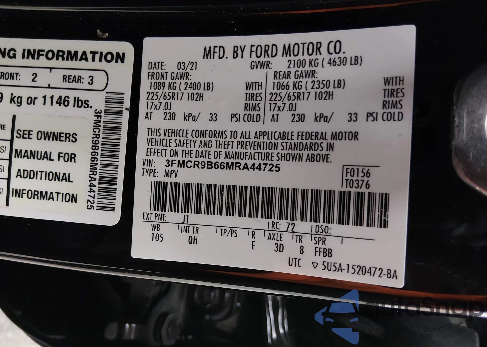 LOT: 44025393 VIN: 1FADP5FU7HL112640