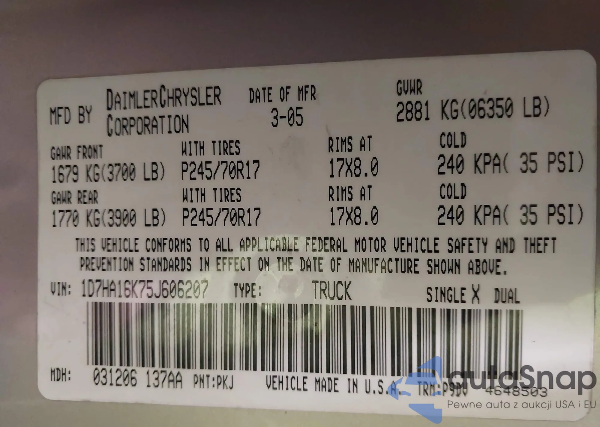 • VIN 1D7HA16K75J606207