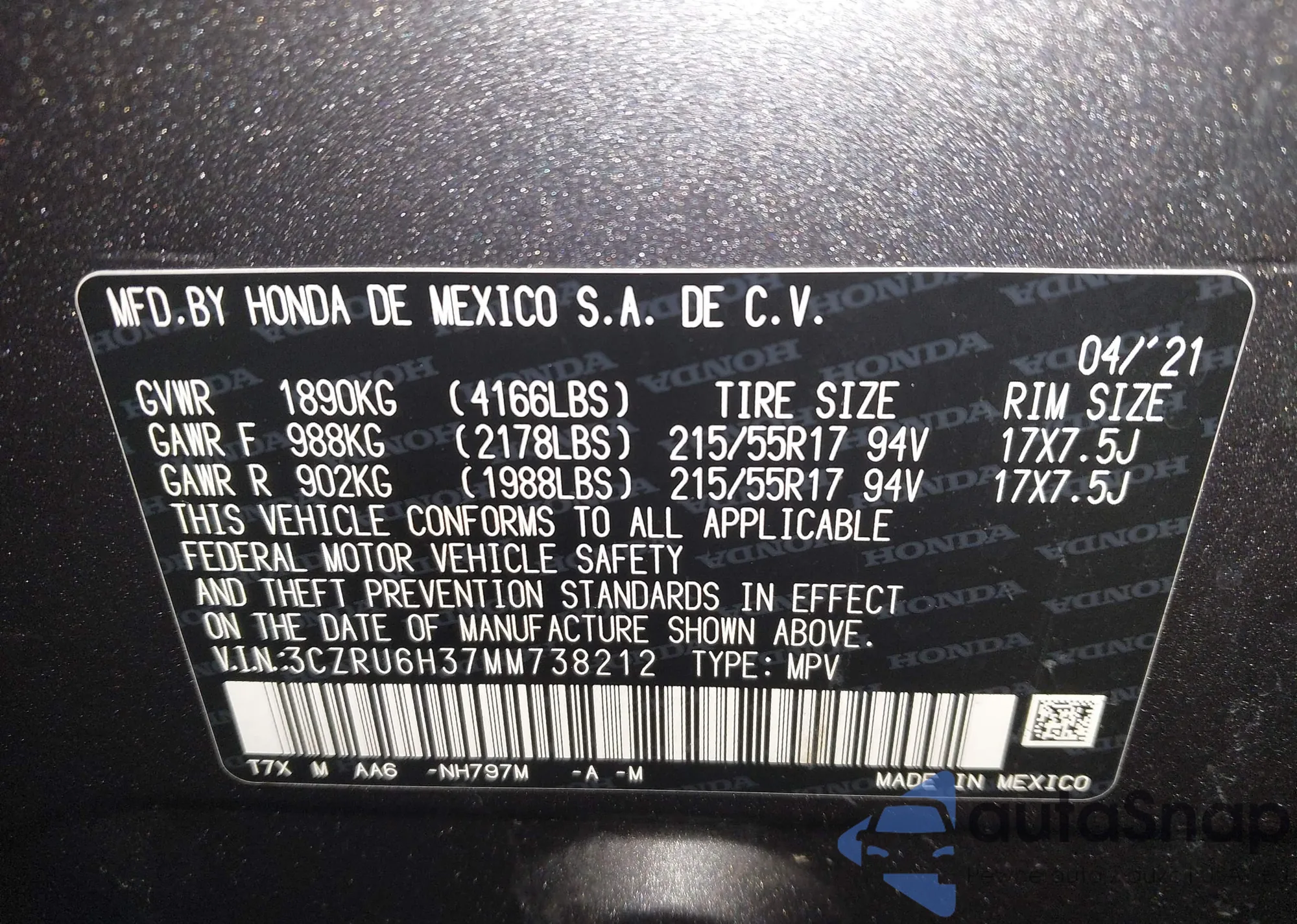 • VIN 3CZRU6H37MM738212
