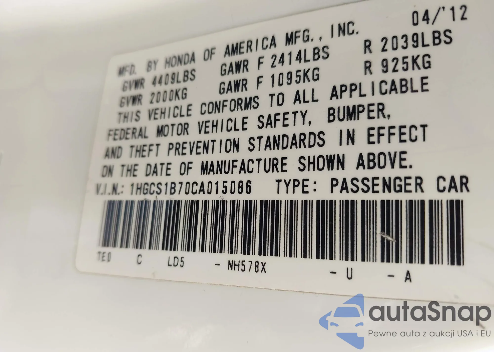 LOT: 43960799 VIN: 5FNYF4H54DB084534