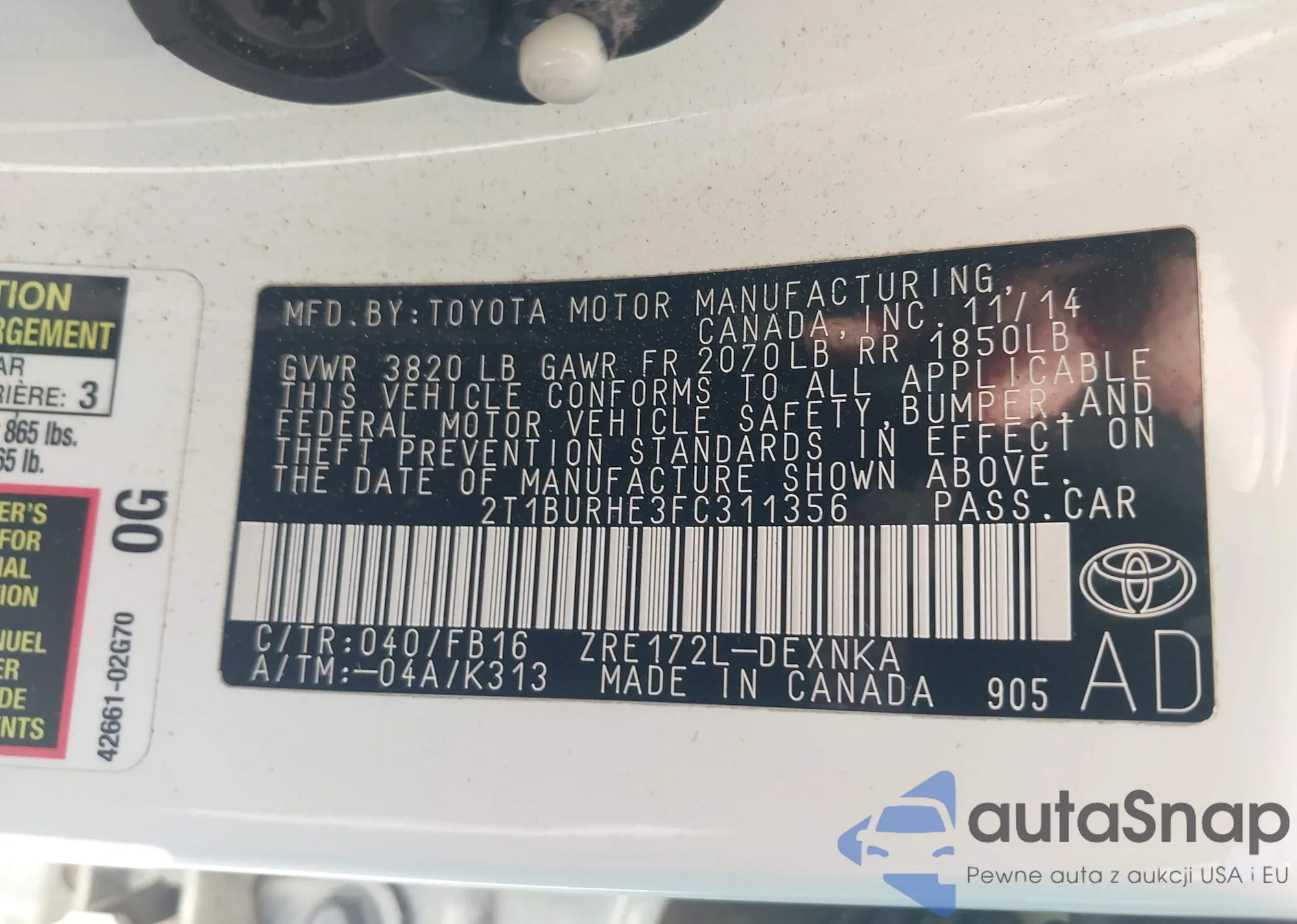 LOT: 43976827 VIN: 2T1BURHE3FC311356
