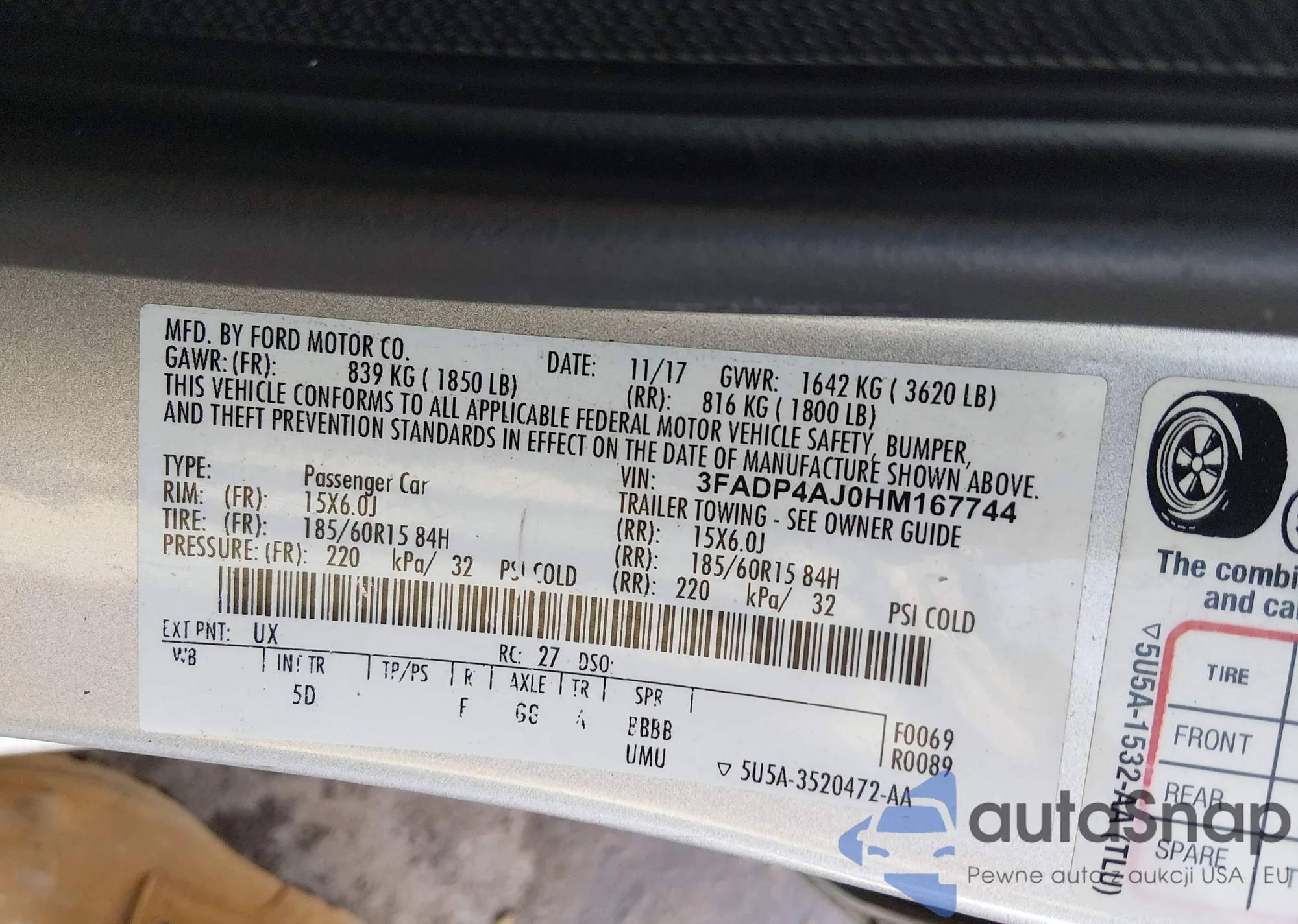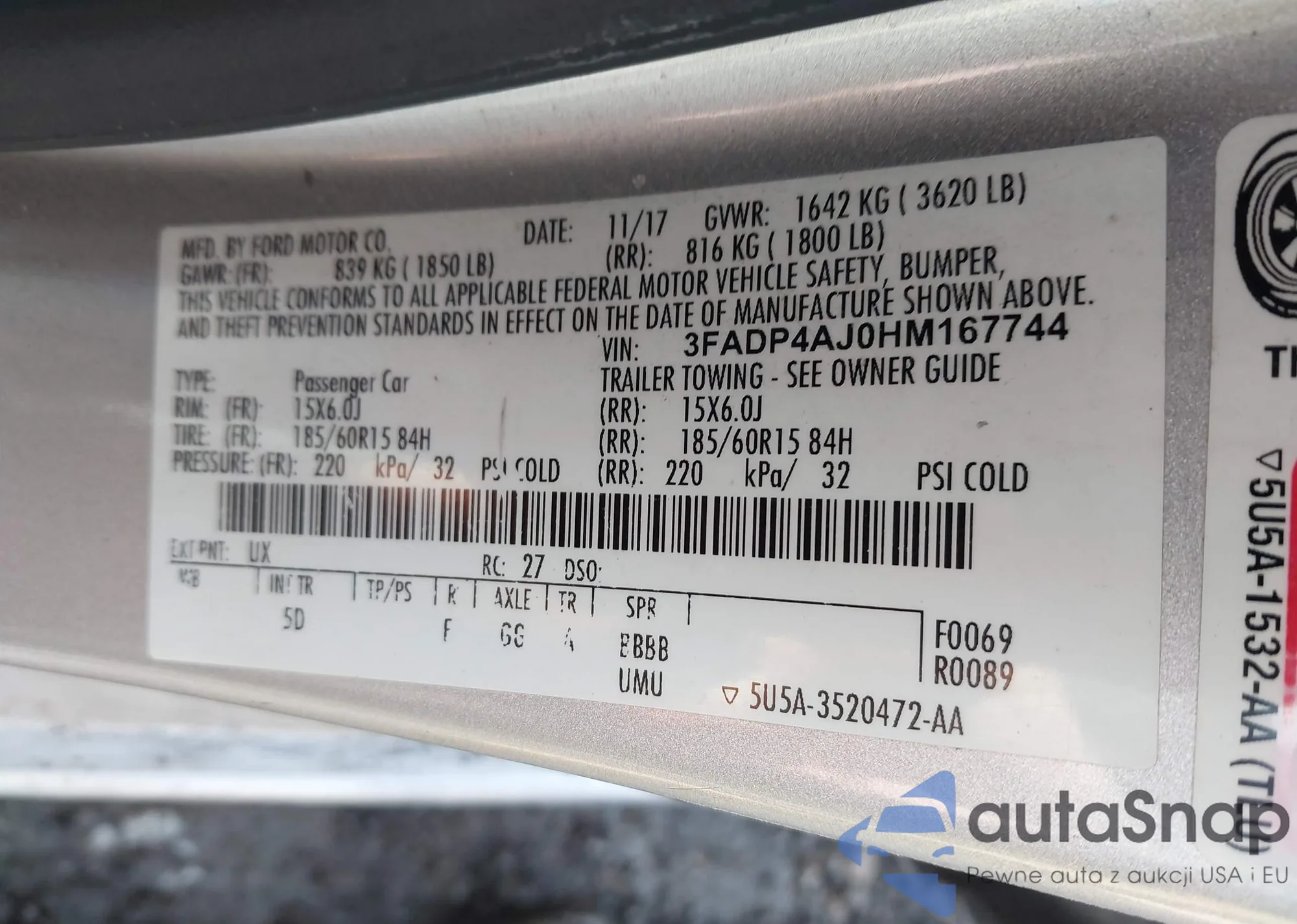 LOT: 43977493 VIN: 3FADP4AJ0HM167744
