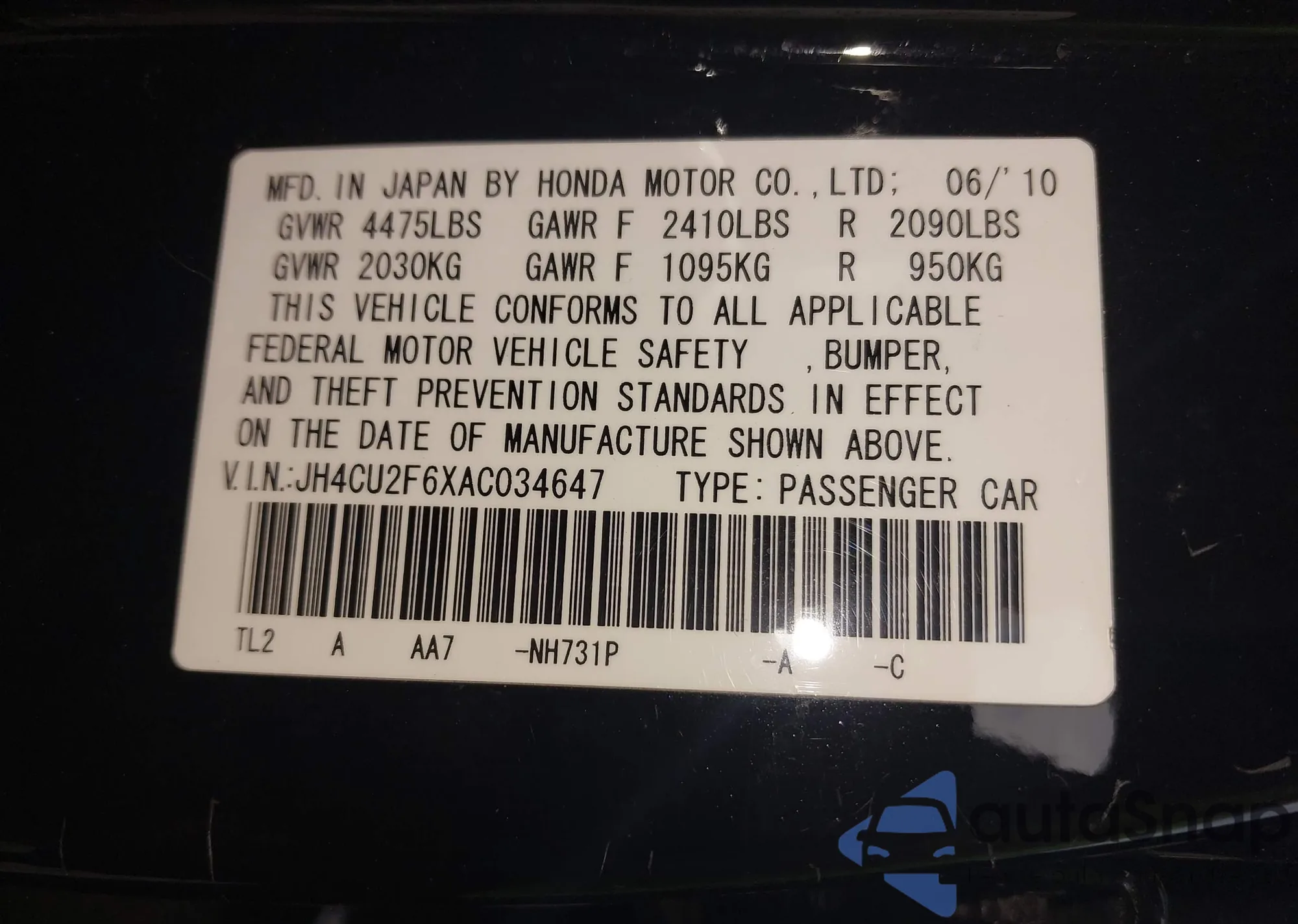 LOT: 43992572 VIN: JH4CU2F6XAC034647