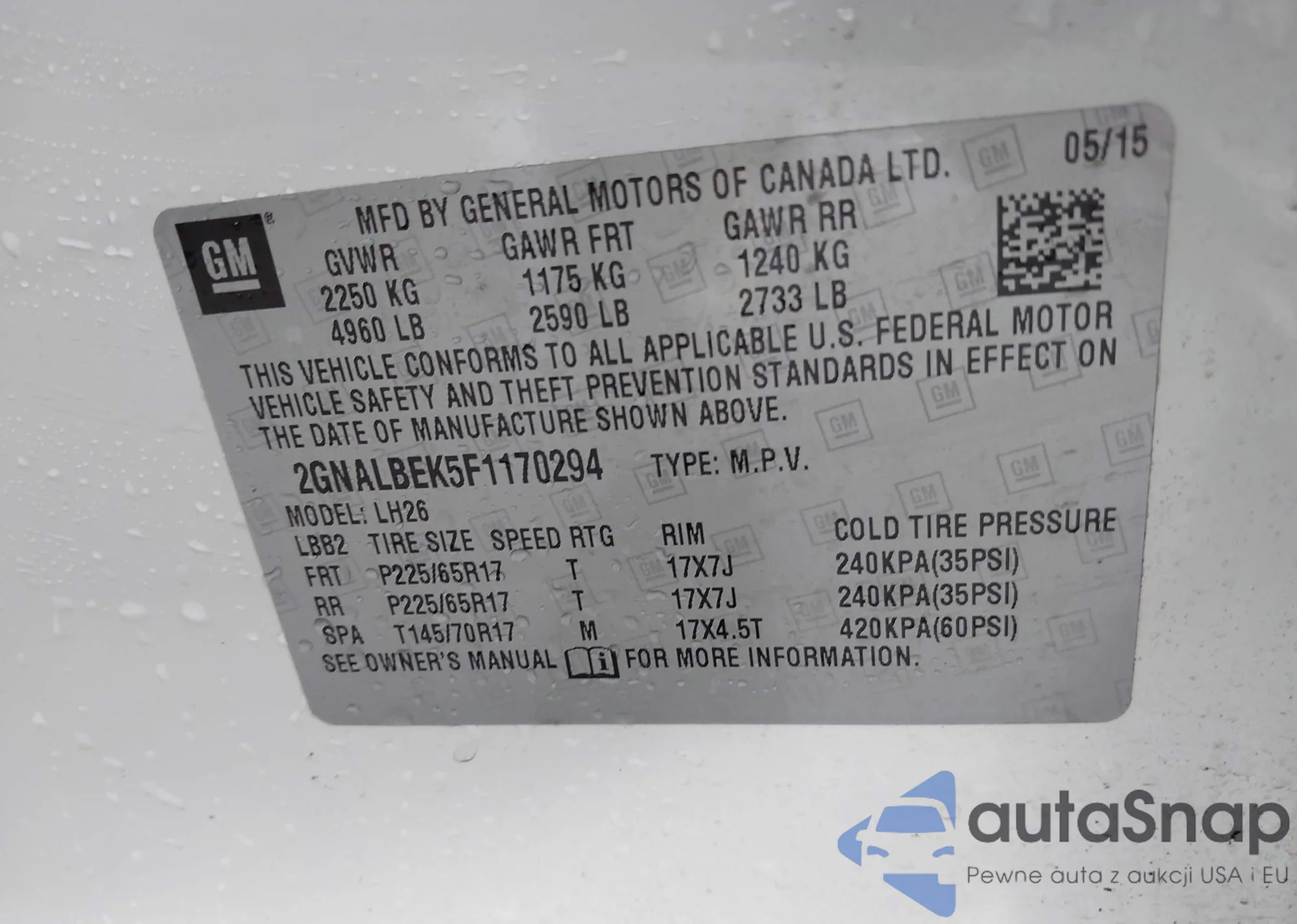 LOT: 43927421 VIN: 2GNALBEK5F1170294