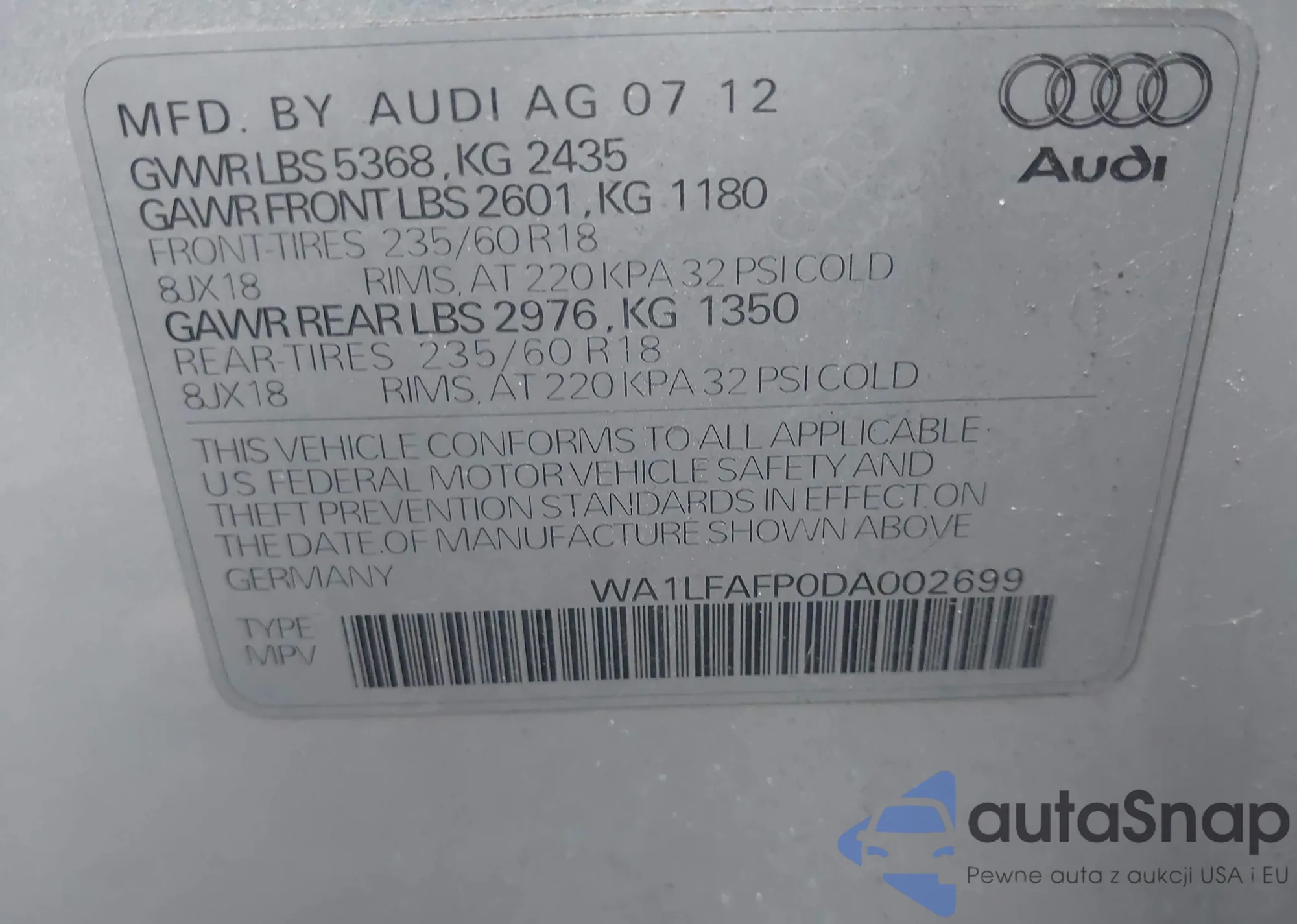 LOT: 43930140 VIN: WA1LFAFP0DA002699