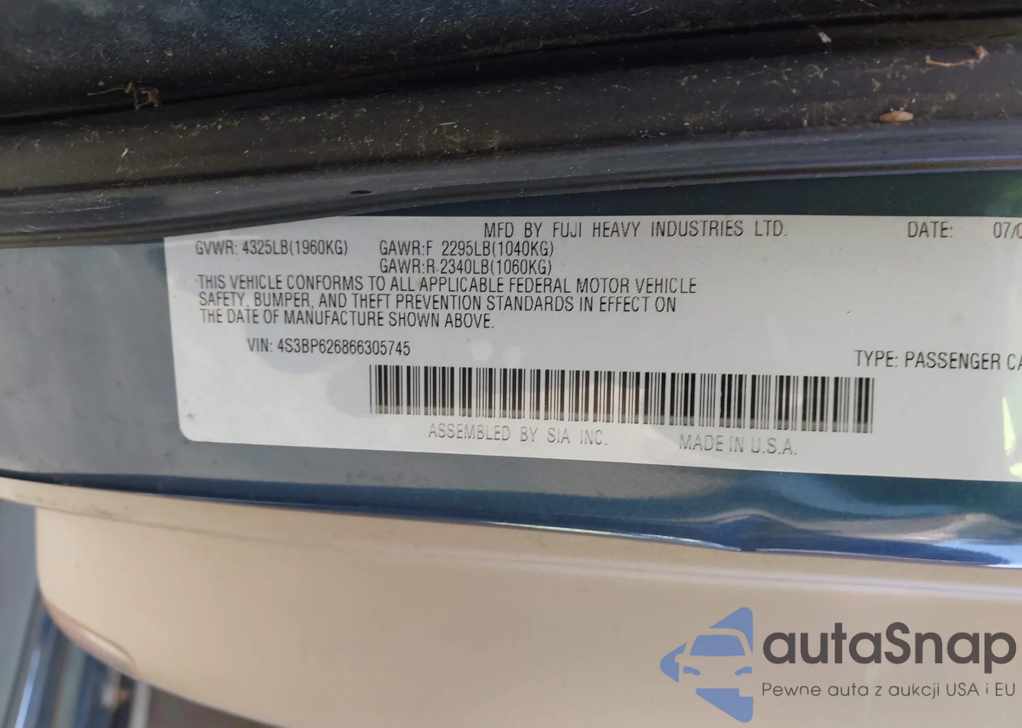 • VIN 4S3BP626866305745
