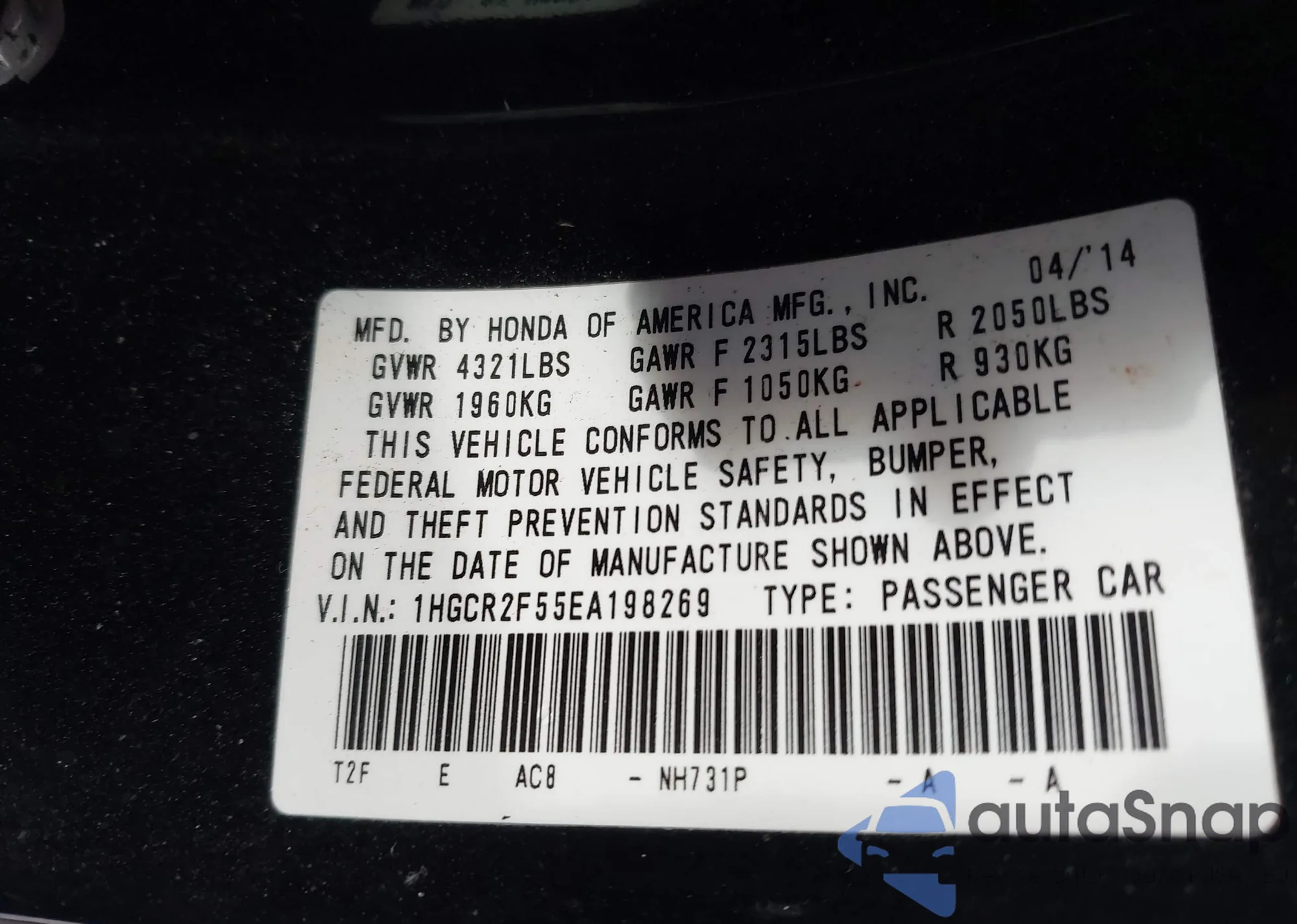 • VIN 1HGCR2F55EA198269