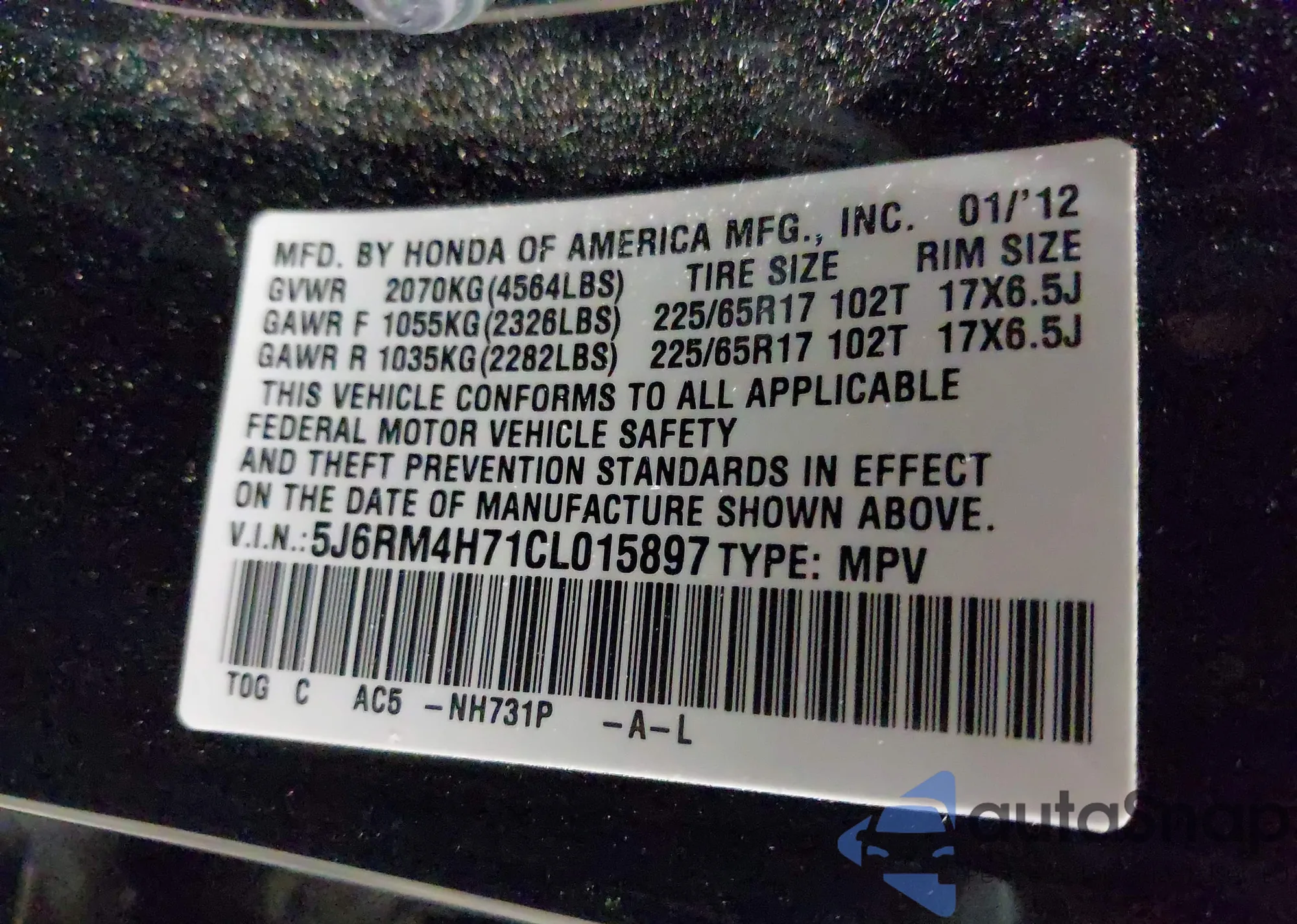 • VIN 5J6RW1H52JA001197