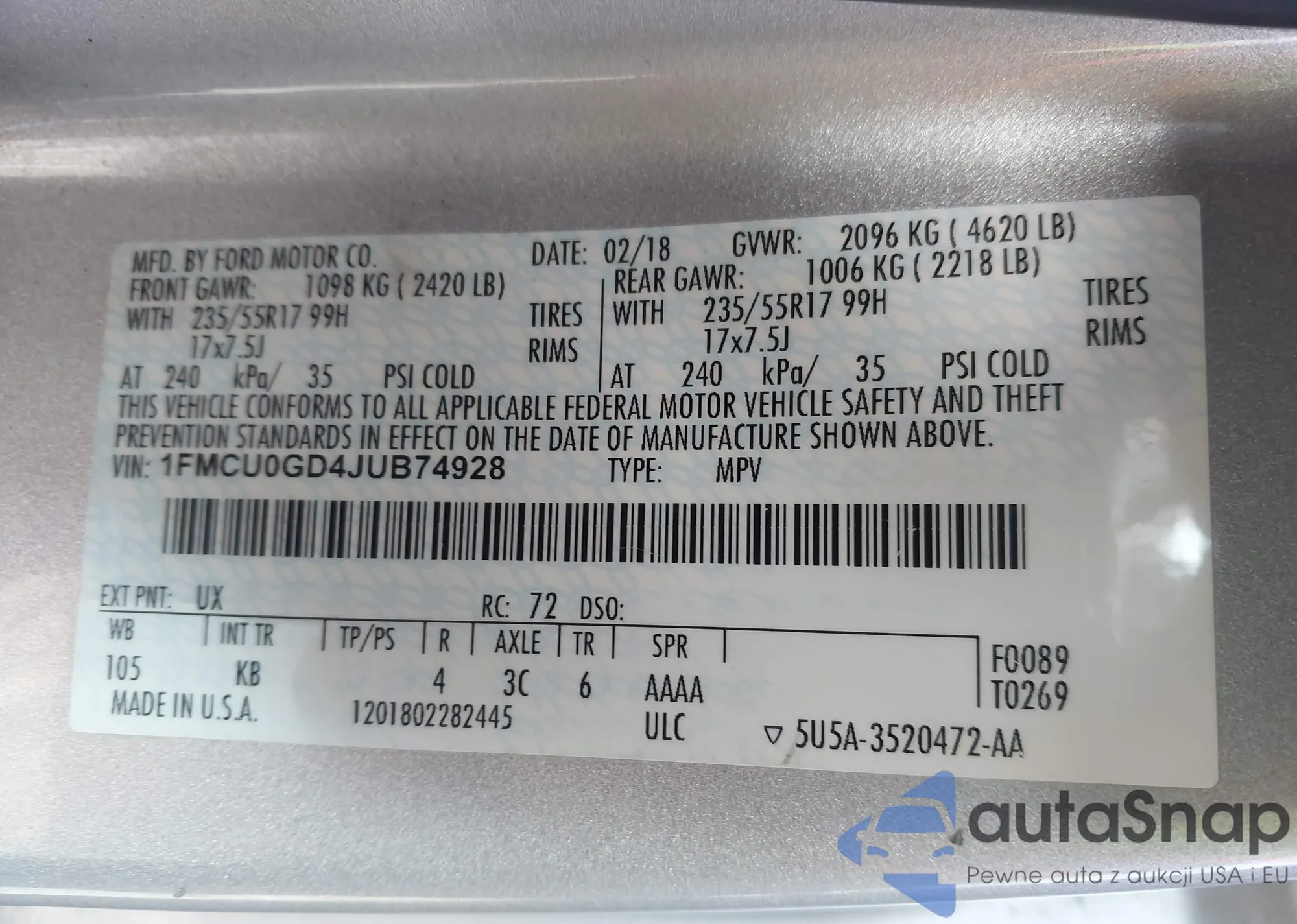 • VIN 1FMCU0GD4JUB74928