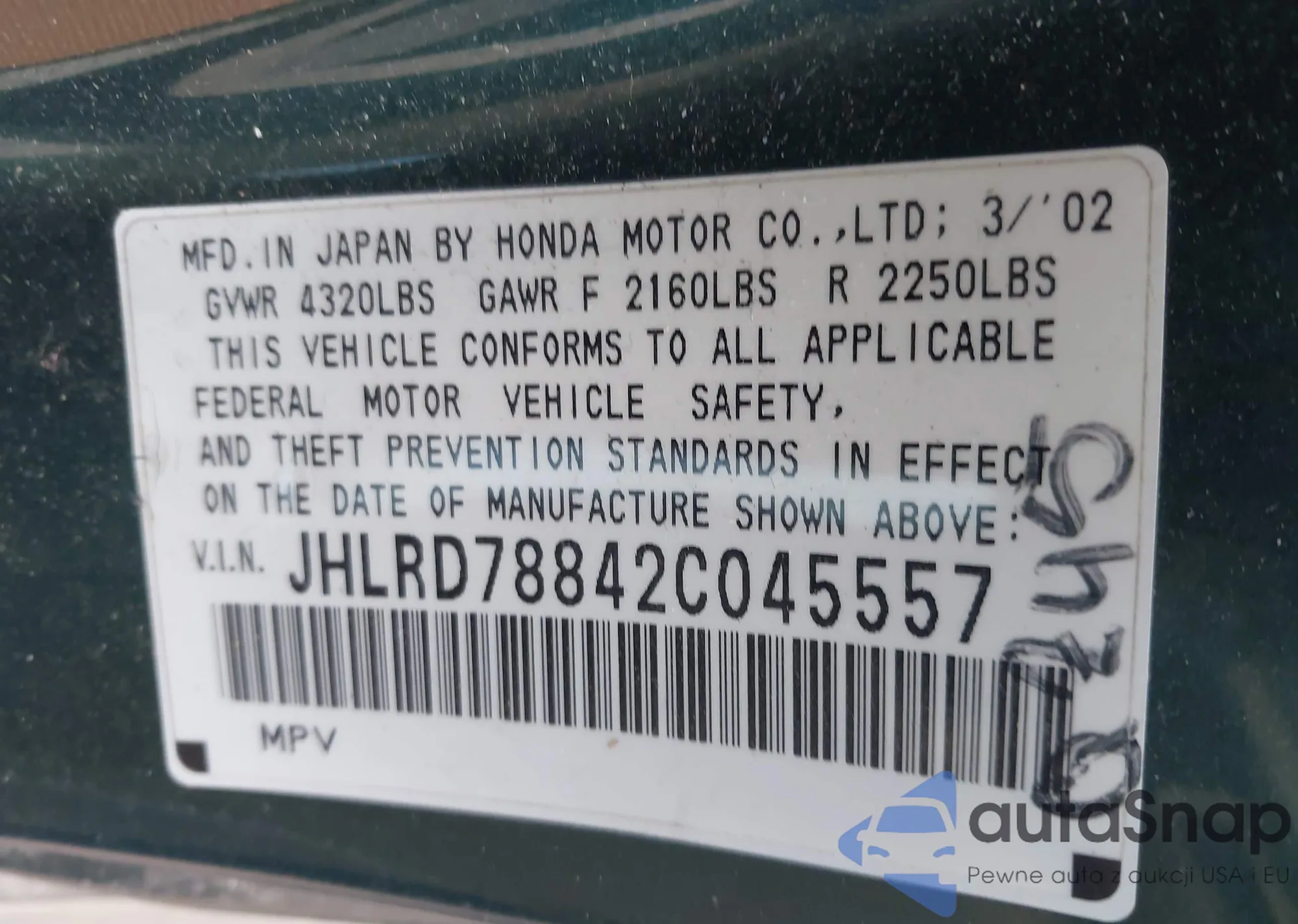 • VIN 2HKRM3H77EH548327