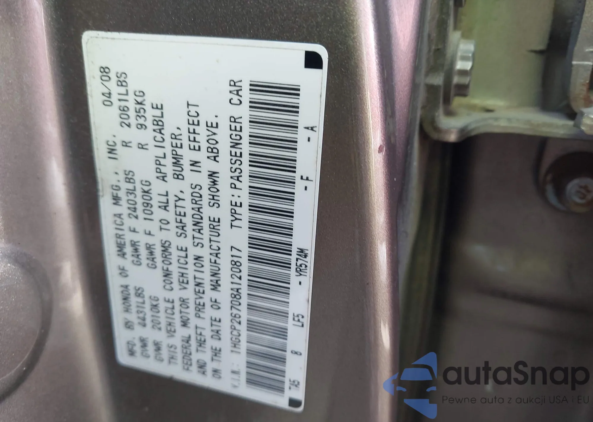 LOT: 44128983 VIN: 1HGCP26708A120817