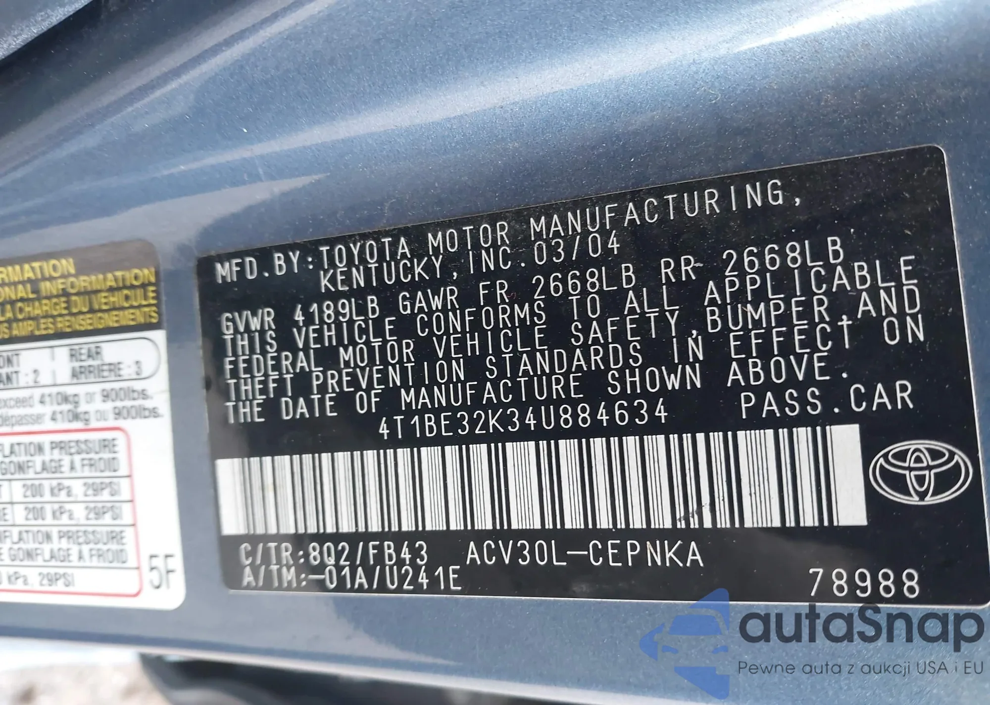 • VIN 4T1BE32K34U884634