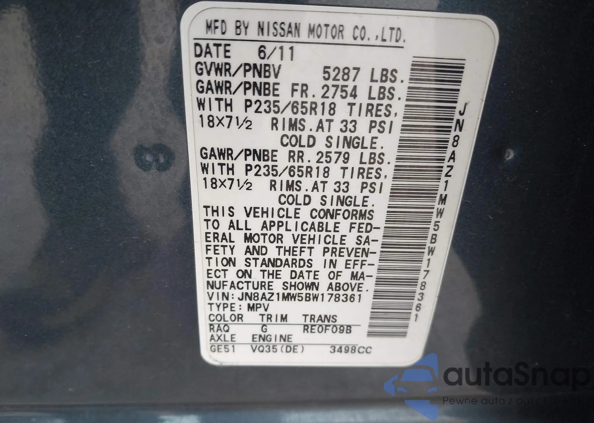 • VIN JN8AZ1MW5BW178361