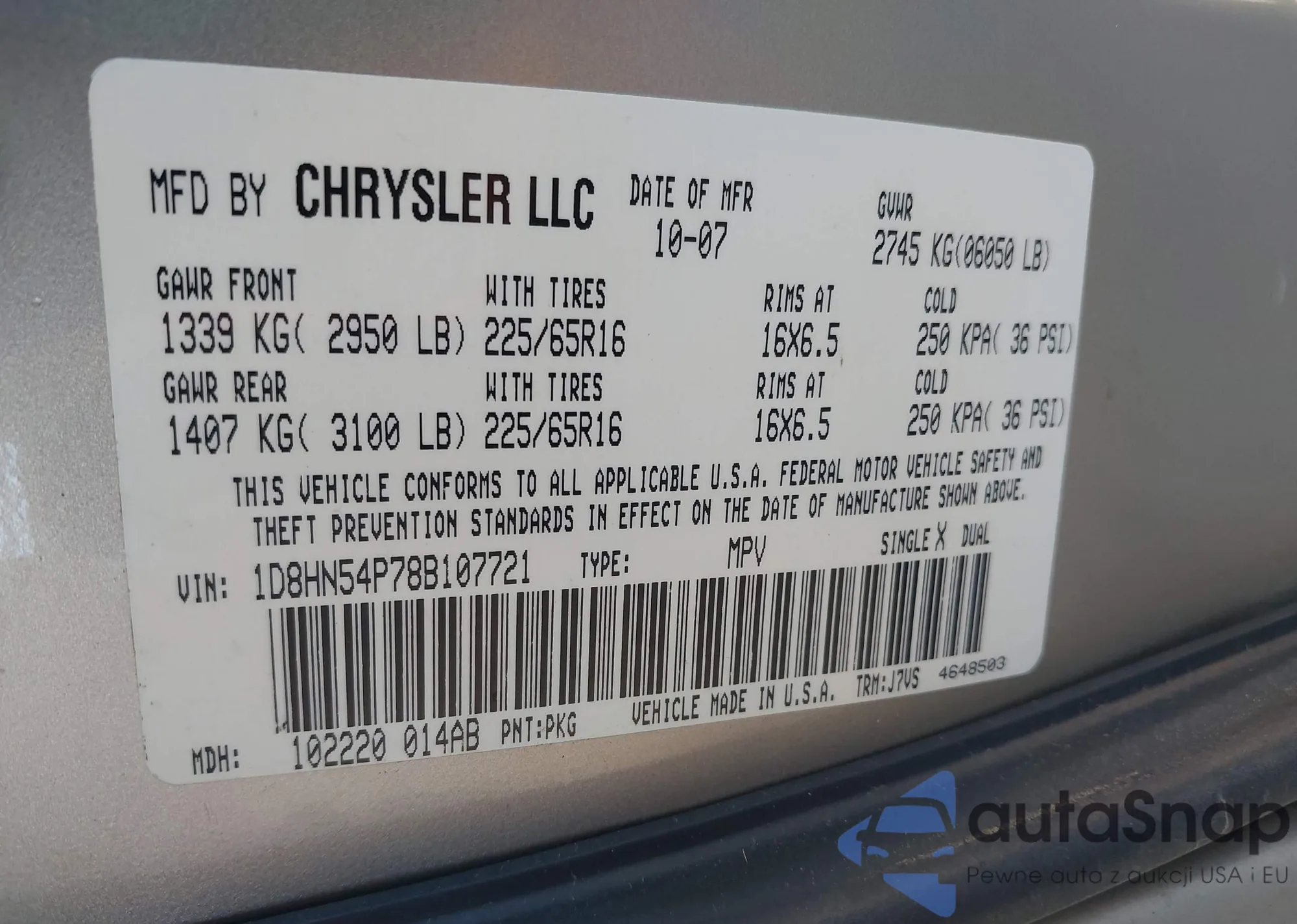 • VIN 1D8HN54P78B107721