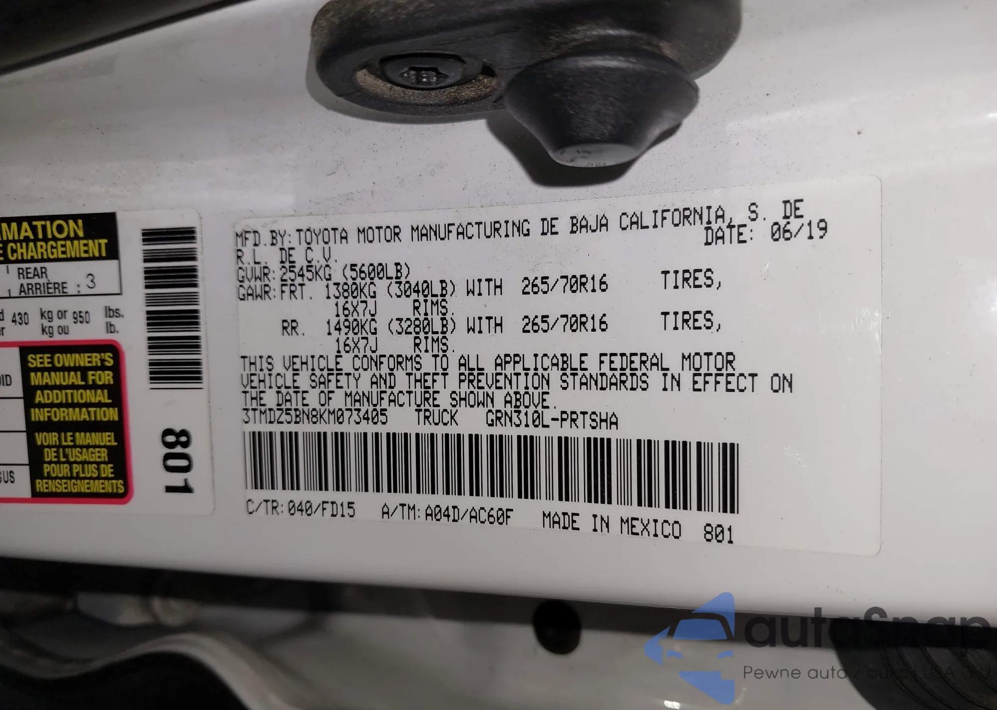 • VIN 3TMDZ5BN8KM073405
