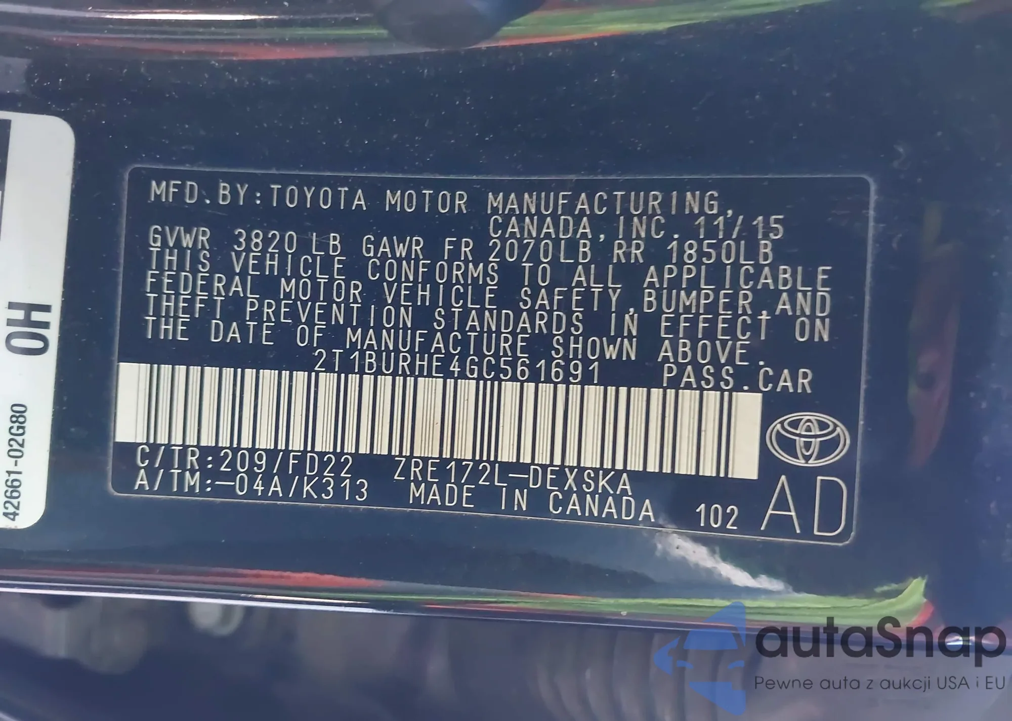LOT: 43700365 VIN: 2T1BURHE4GC561691