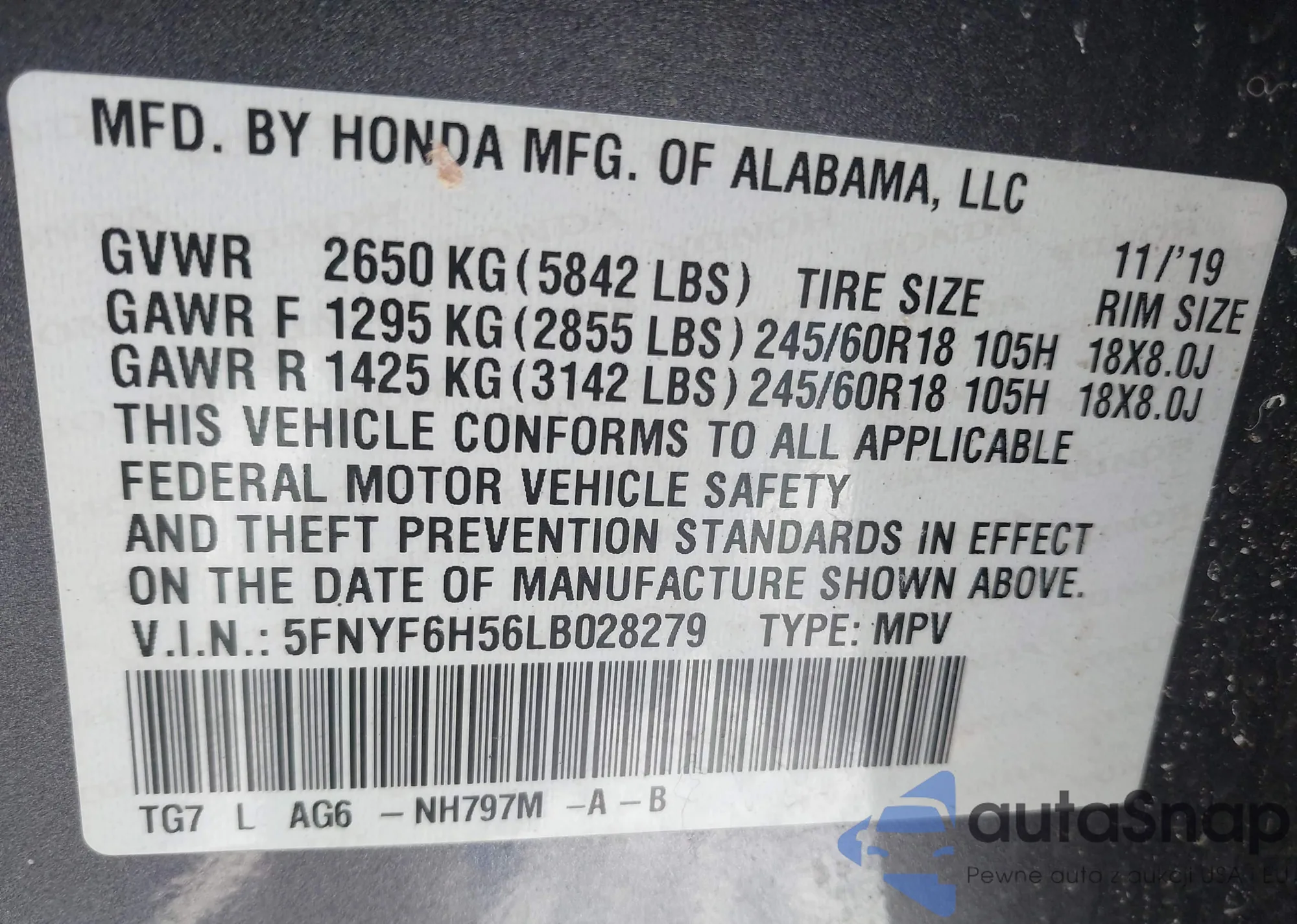 • VIN 5FNYF6H56LB028279