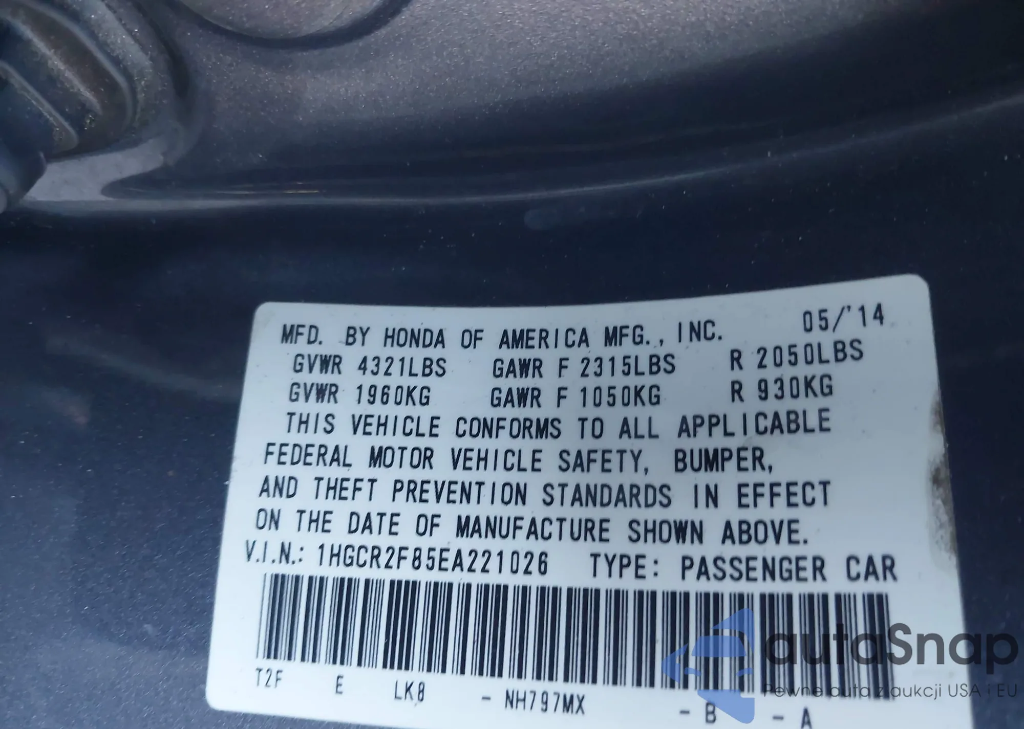 • VIN 1HGCR2F85EA221026