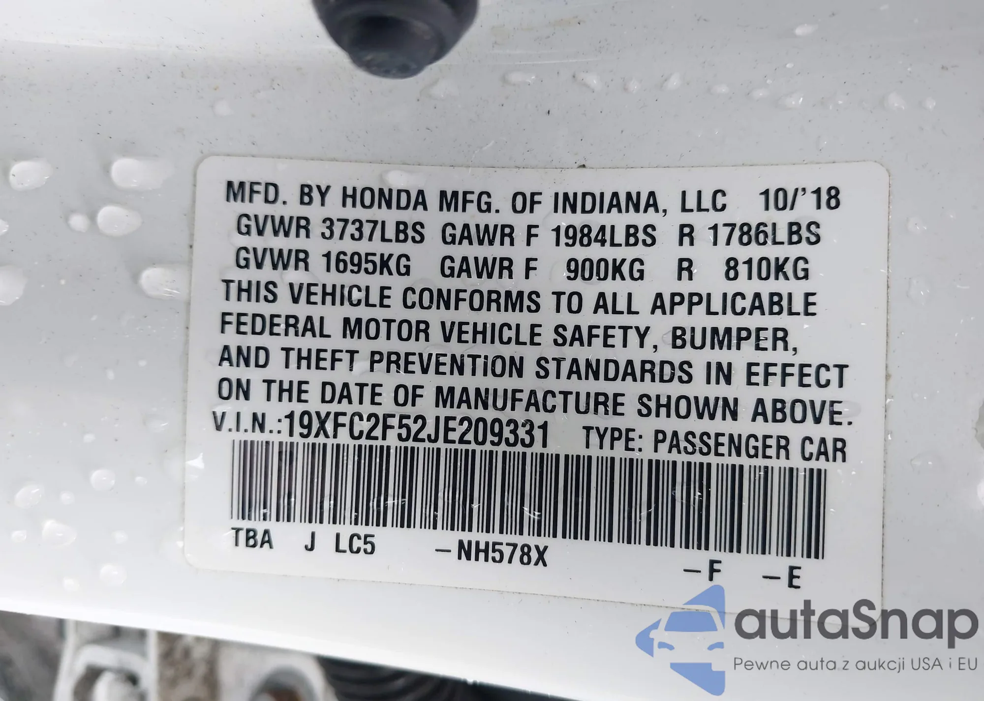 LOT: 41956403 VIN: 19XFC2F52JE209331
