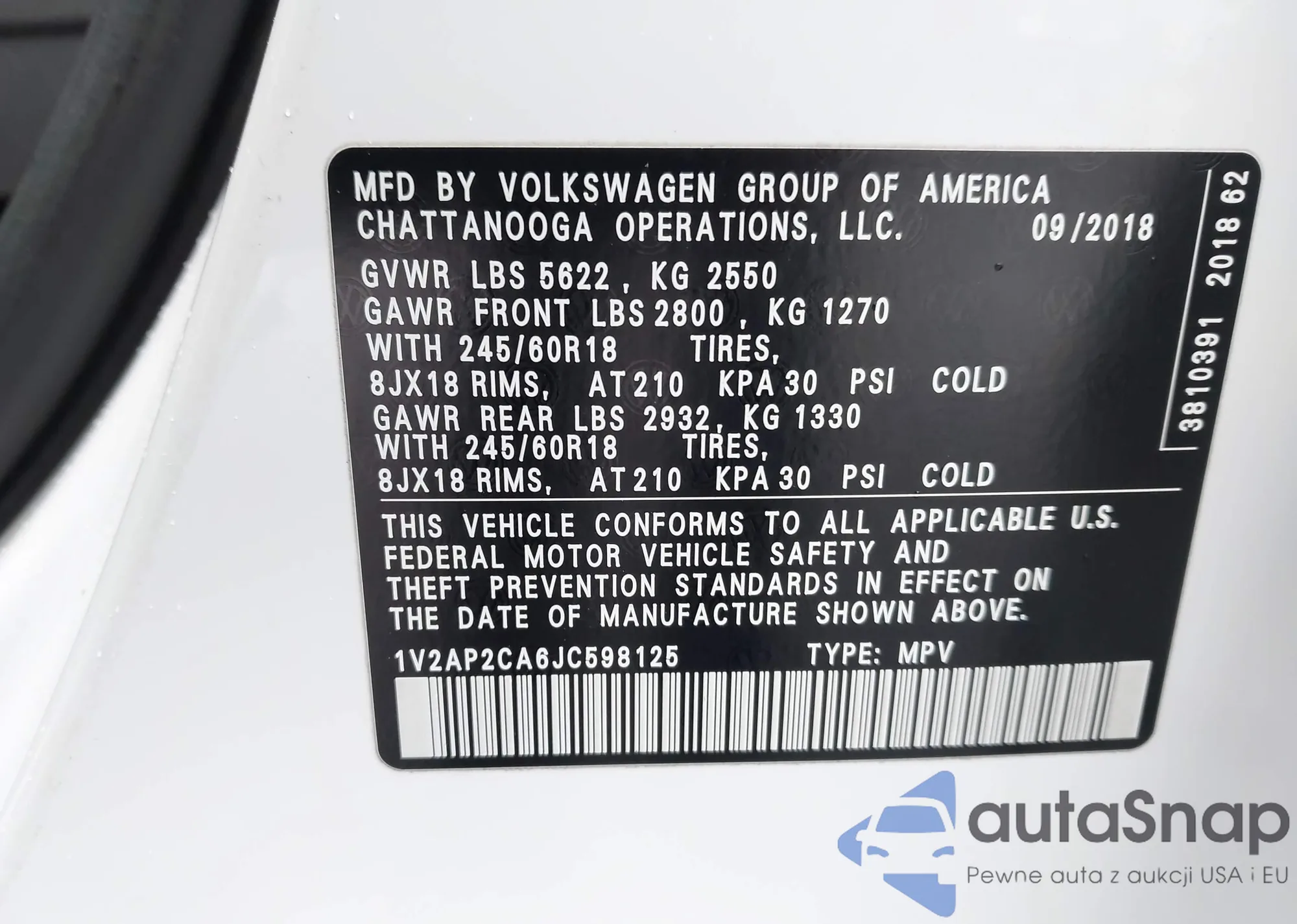 LOT: 43703496 VIN: 1V2AP2CA6JC598125