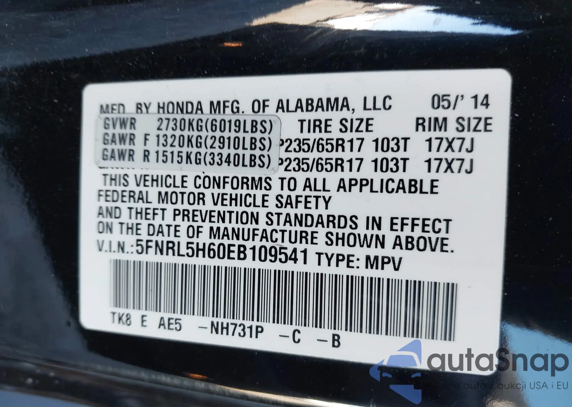 • VIN 5FNRL5H60EB109541