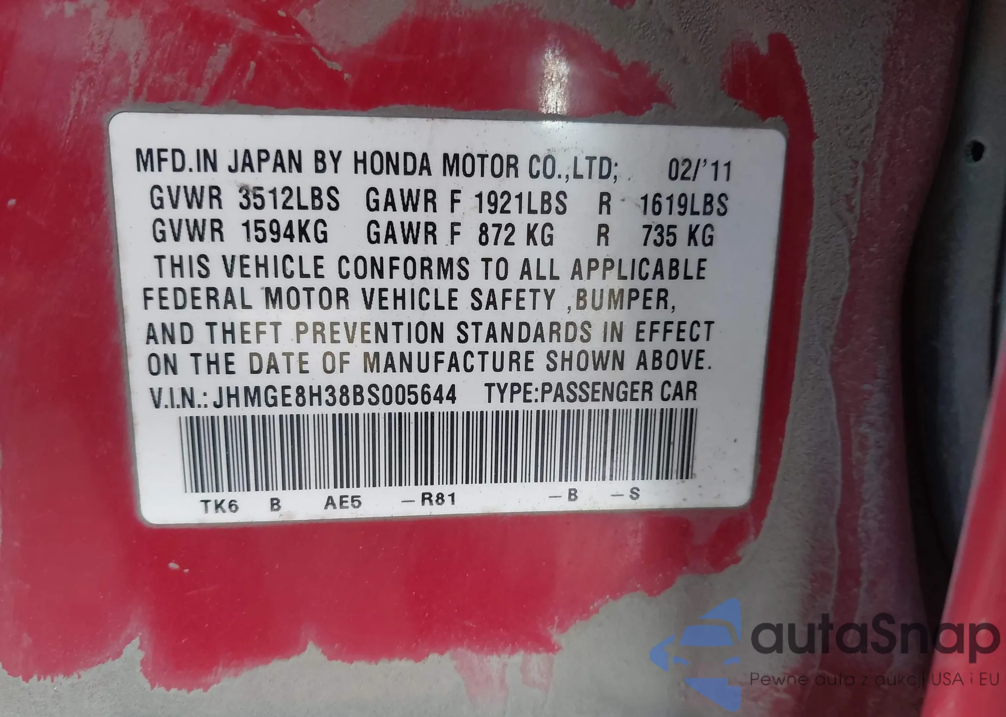 LOT: 44094158 VIN: JHMGE8H38BS005644