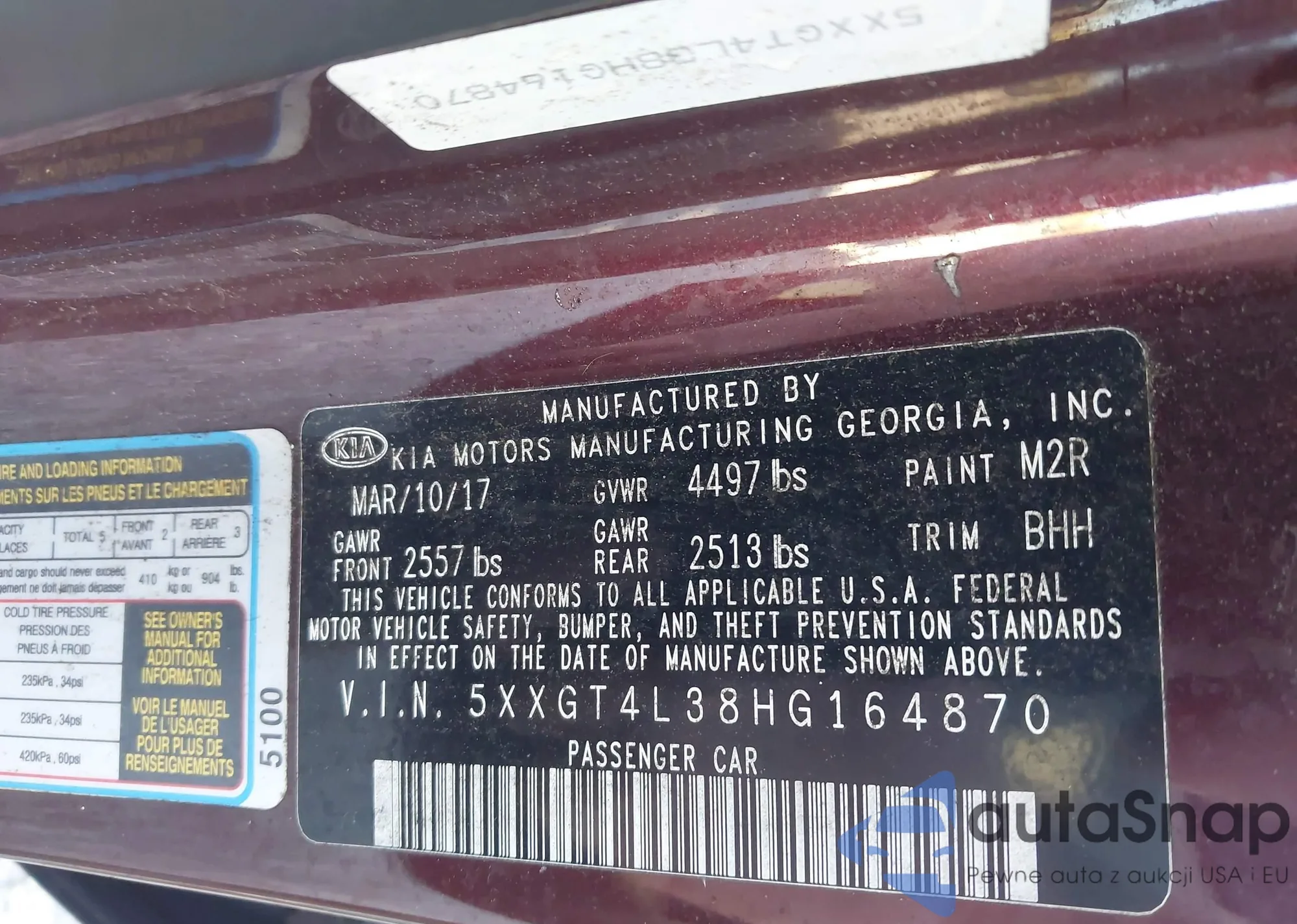 LOT: 43361377 VIN: 5XXGT4L38HG164870