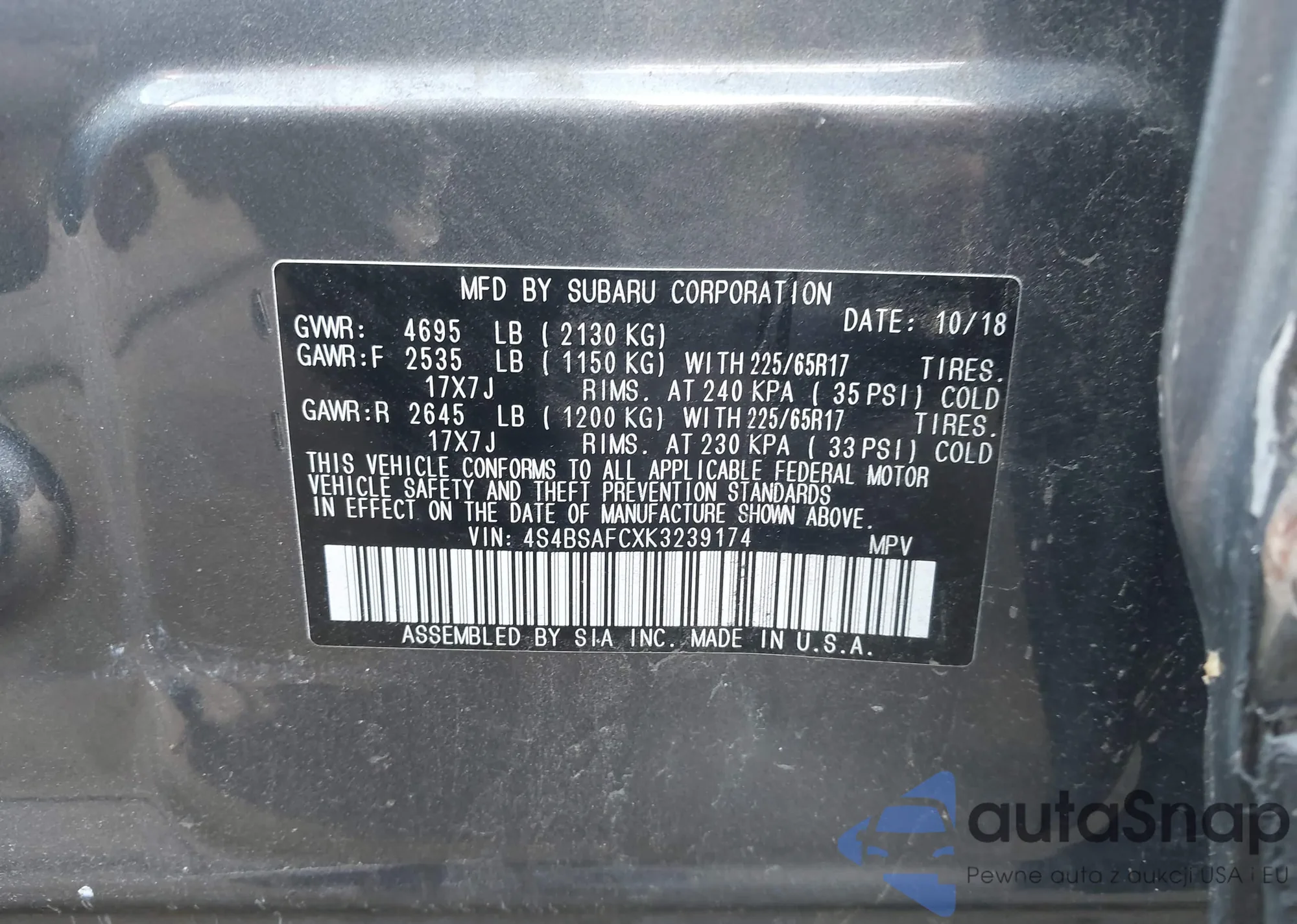 • VIN 4S4BSAFCXK3239174