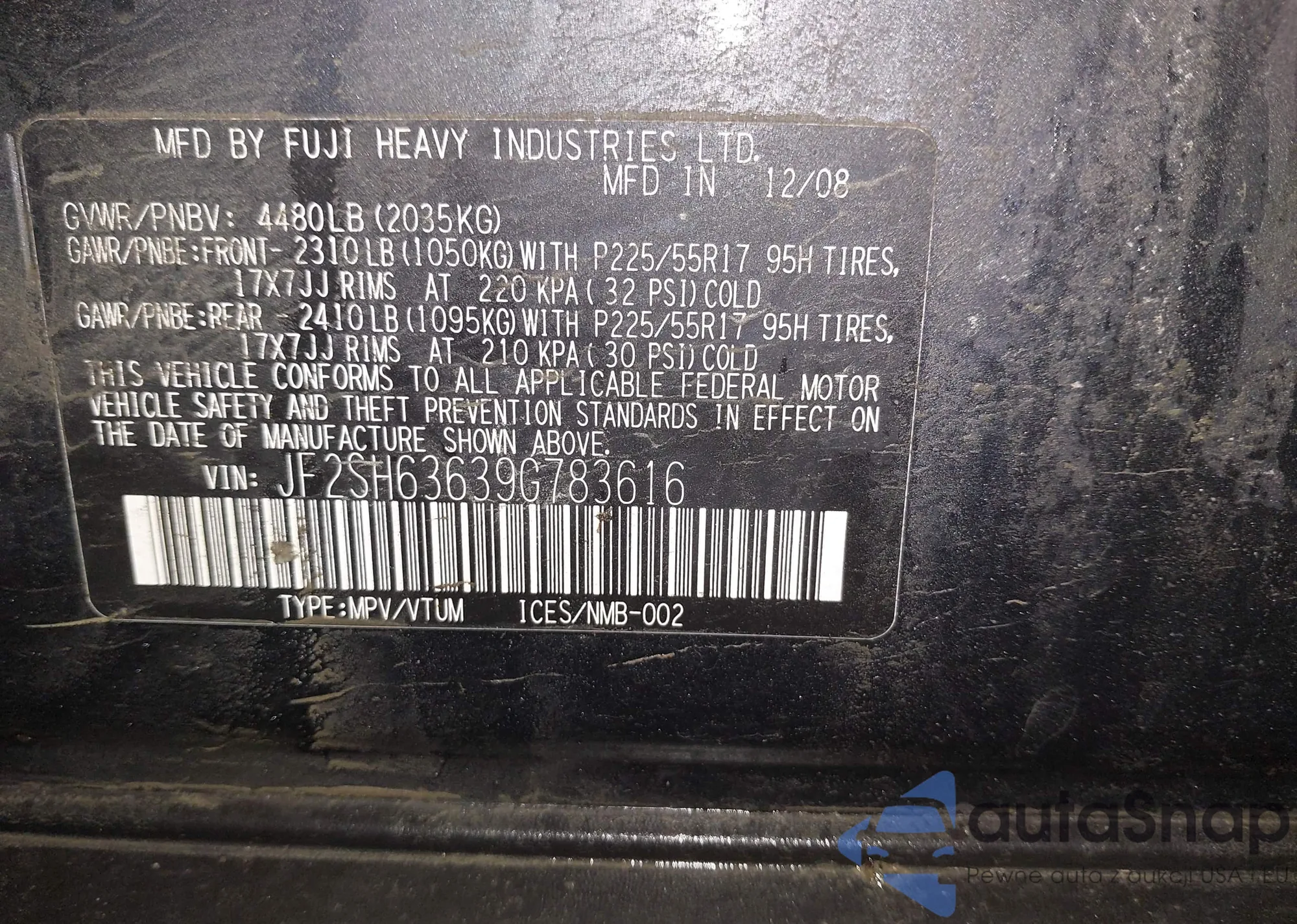 LOT: 43542732 VIN: JF2SH63639G783616