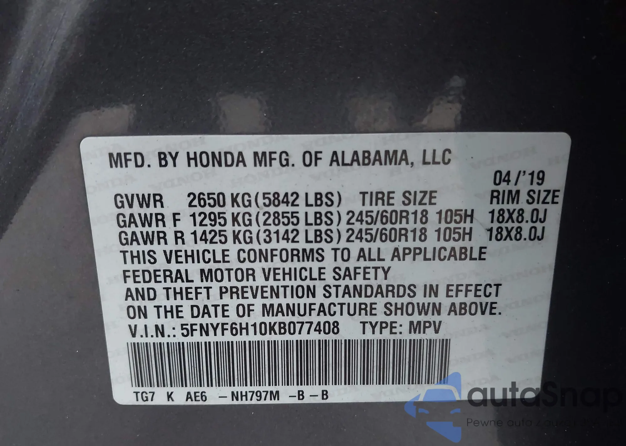 LOT: 43629402 VIN: 5FNYF6H10KB077408