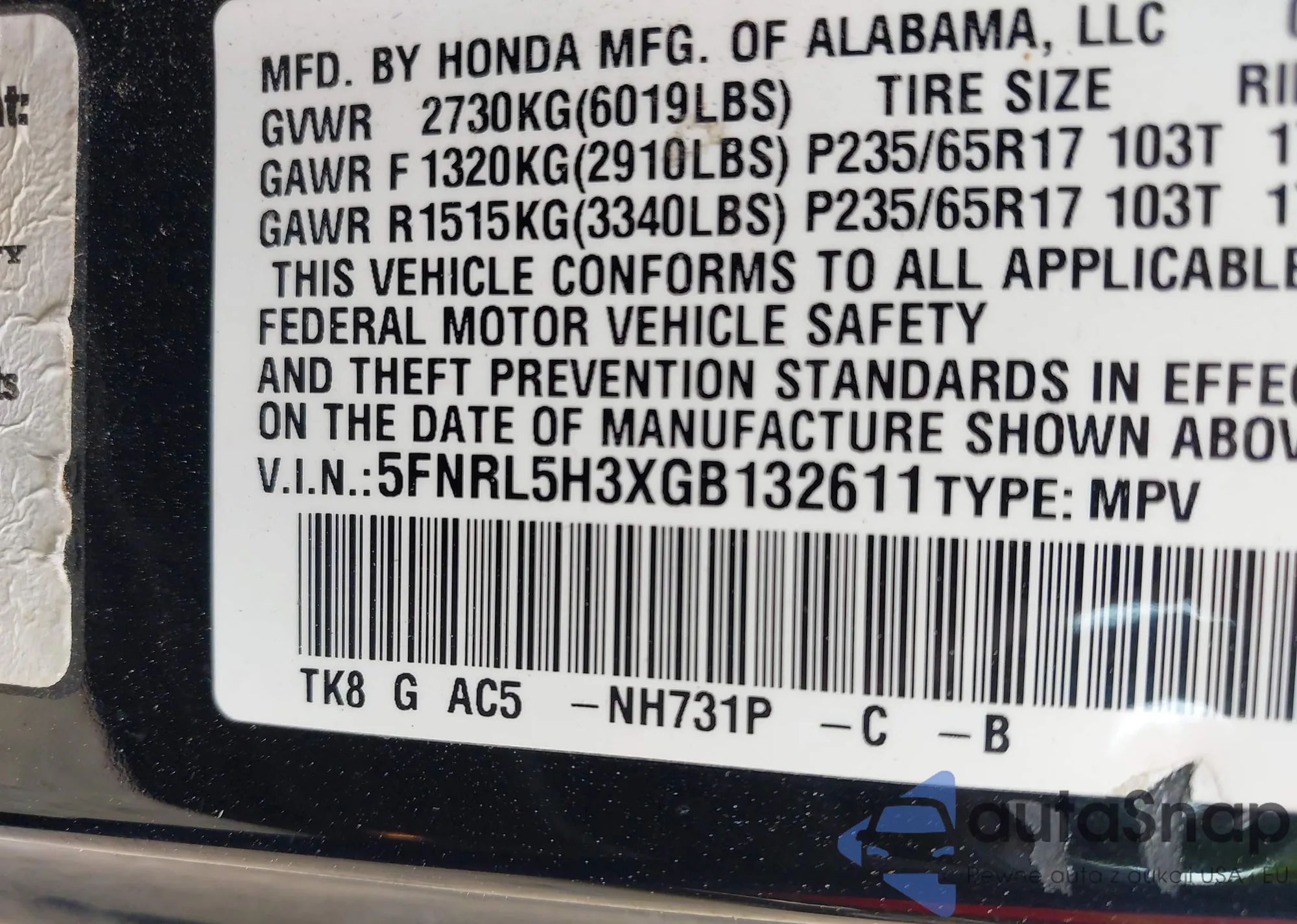 • VIN 5FNRL5H3XGB132611