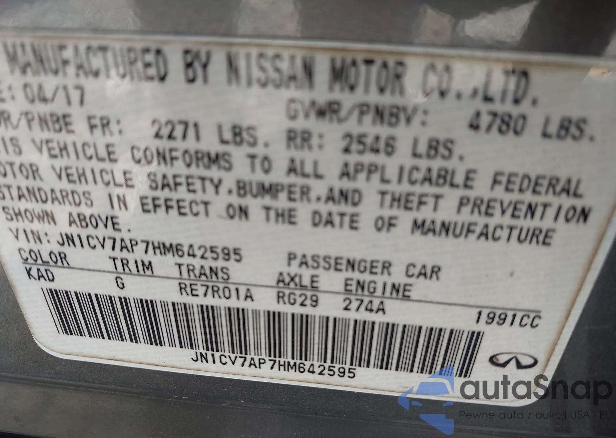 LOT: 43734780 VIN: JN1CV7AP7HM642595