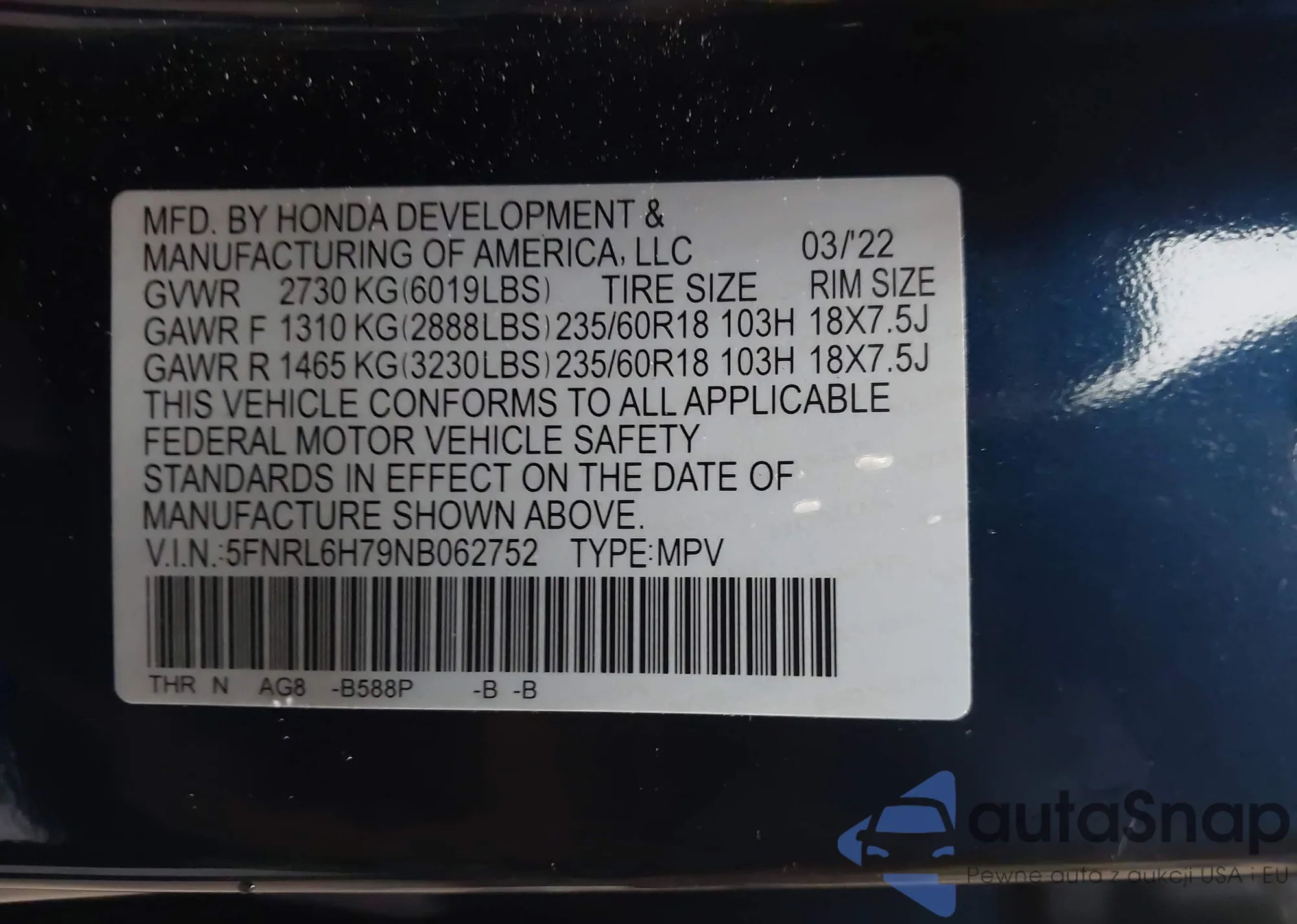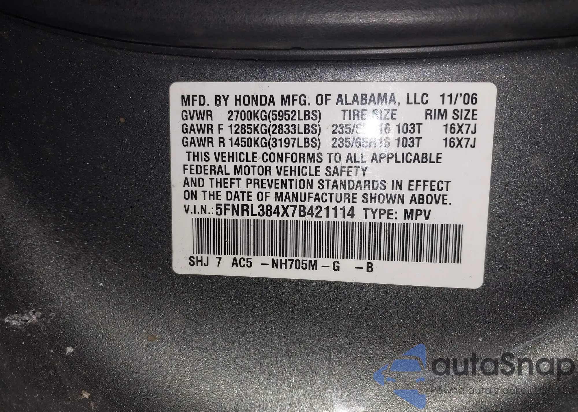 • VIN 5FNRL384X7B421114