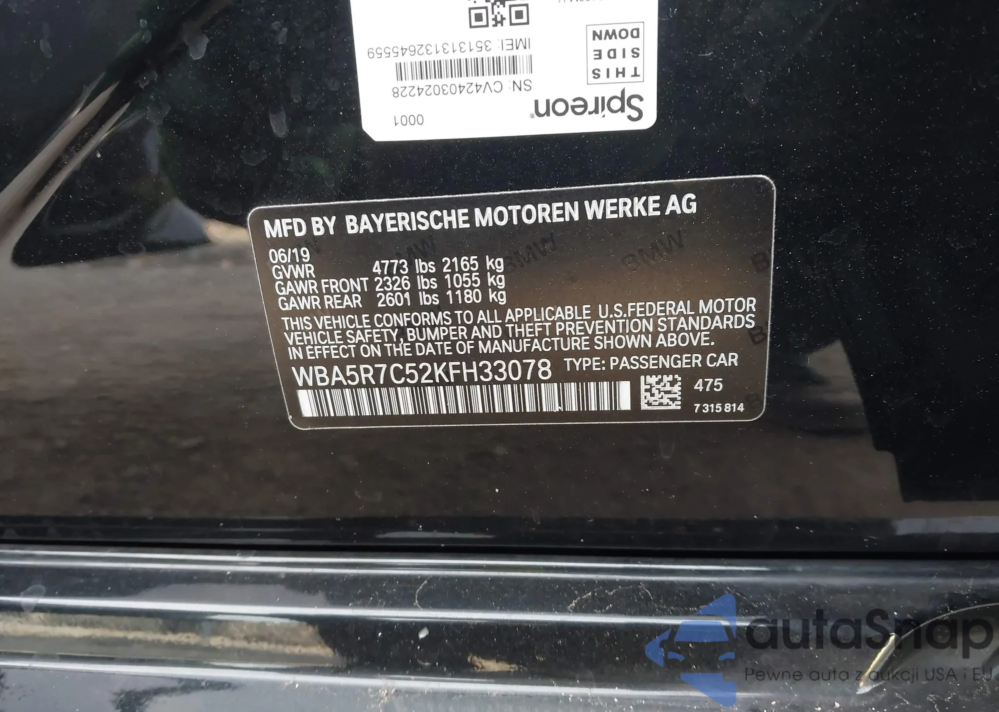 LOT: 43707407 VIN: WBA5R7C52KFH33078