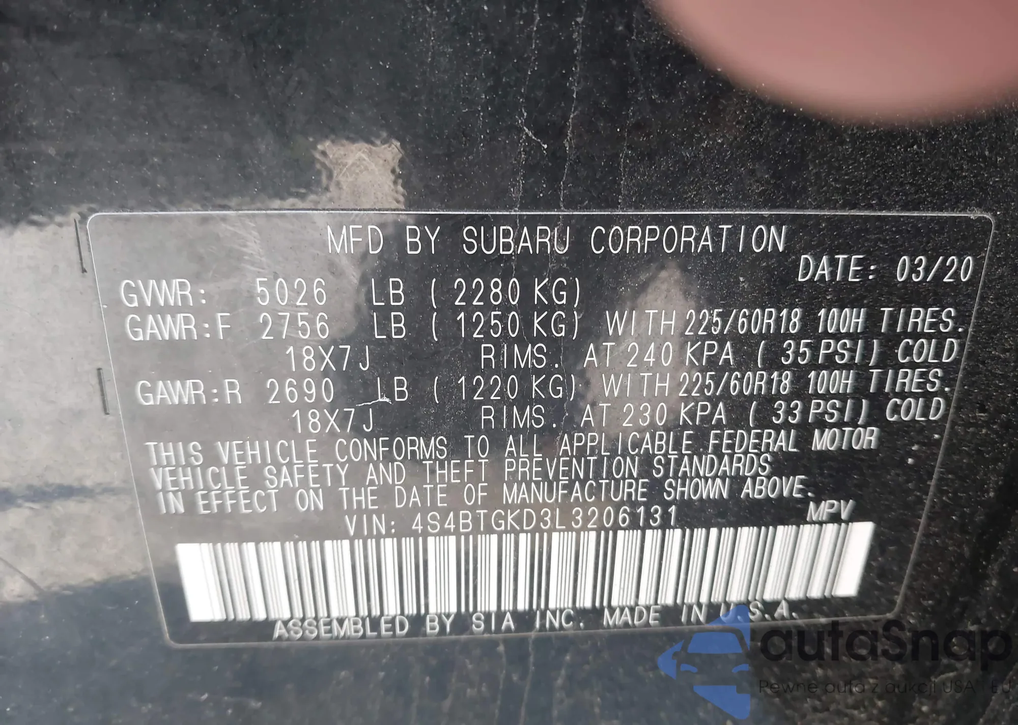 LOT: 43797674 VIN: 4S4BTGKD3L3206131