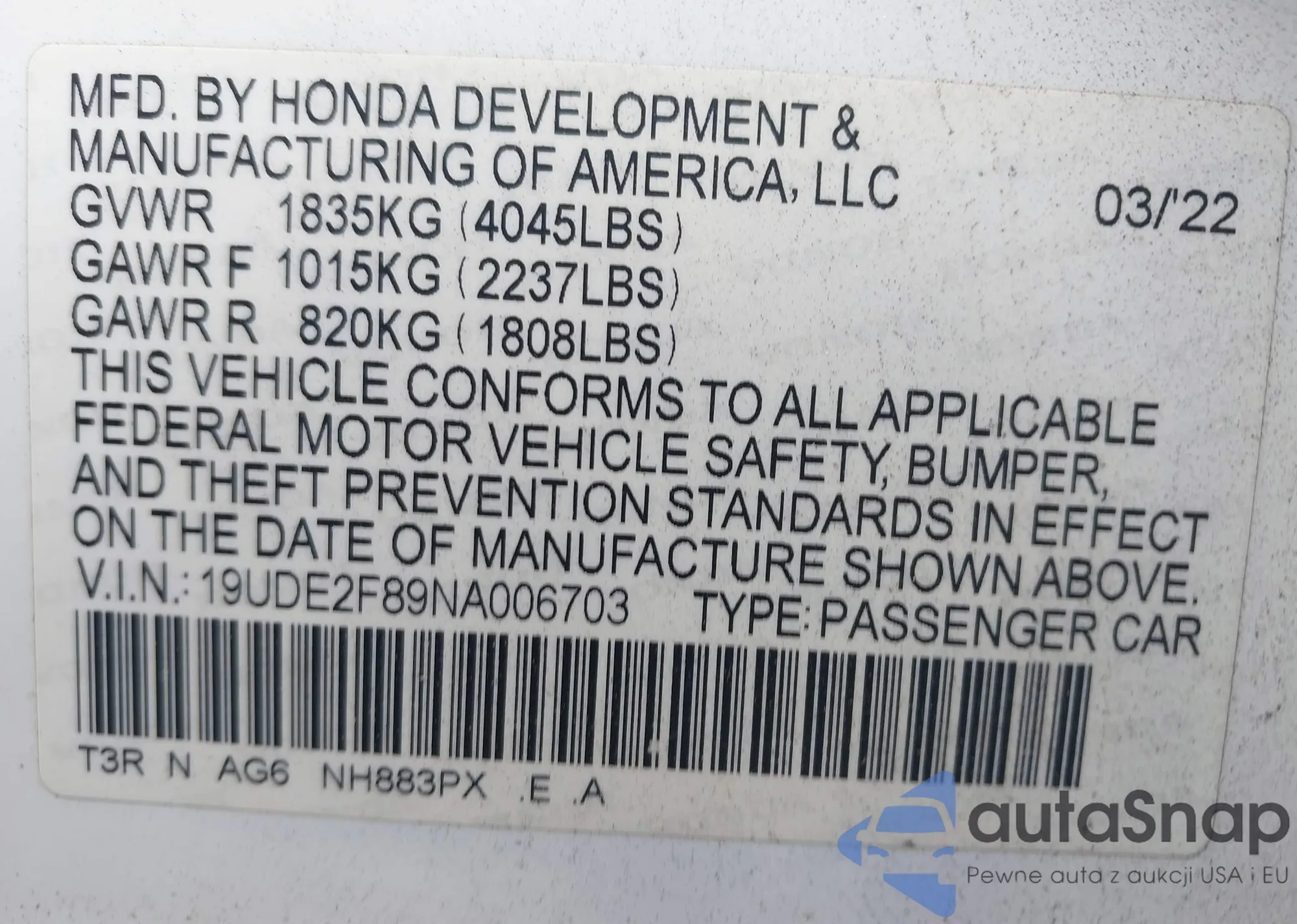 • VIN 19UDE2F89NA006703