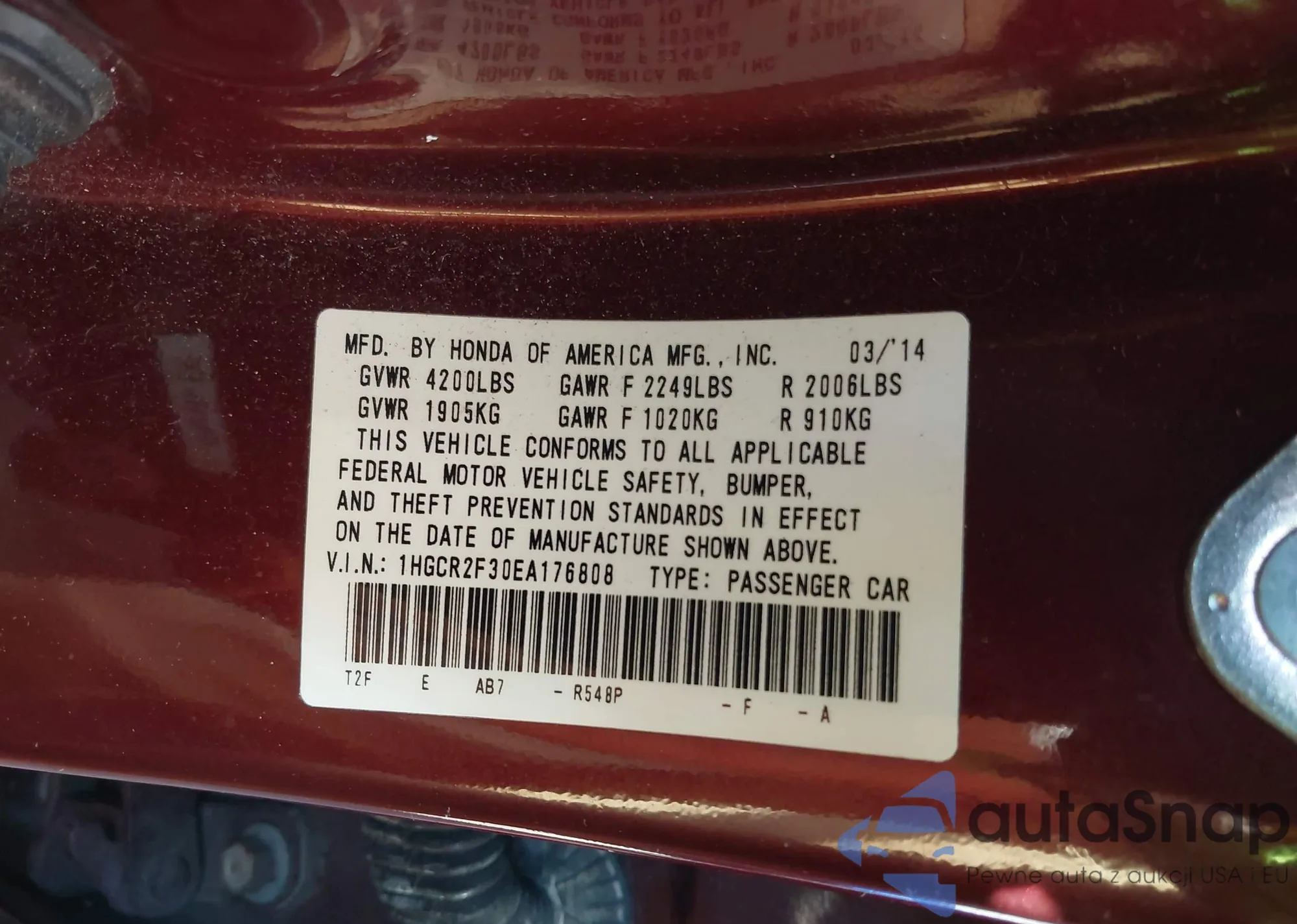 LOT: 44015294 VIN: 1HGCR2F30EA176808